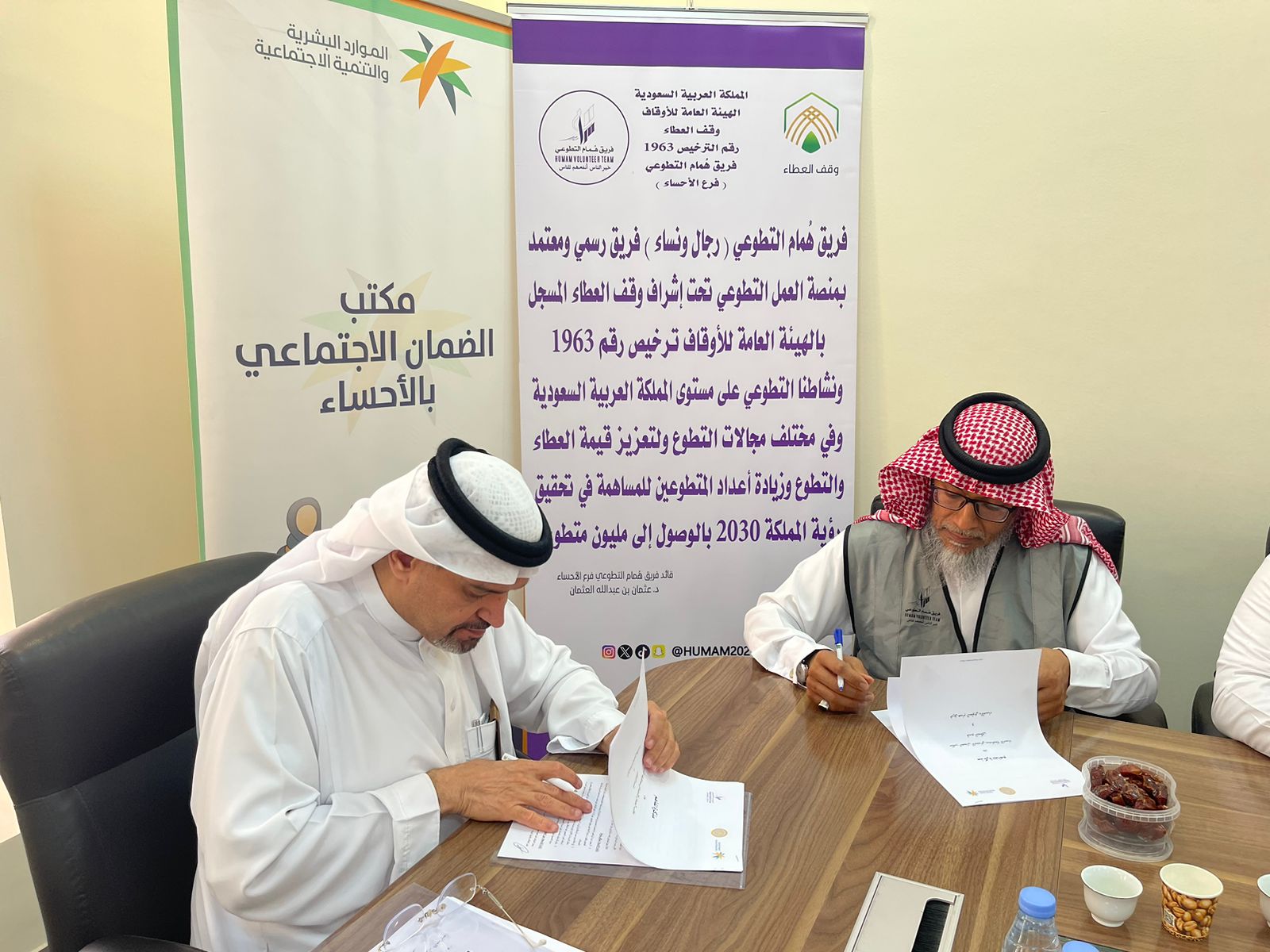 وقع مكتب الضمان الاجتماعي بالأحساء، ممثلاً بقسم التمكين شراكة مجتمعية مع فريق همام التطوعي، وقع الاتفاقية من جانب مكتب الضمان الأستاذ محمدالمسليم ومن جانب فريق همام الدكتور عثمان العثمان .