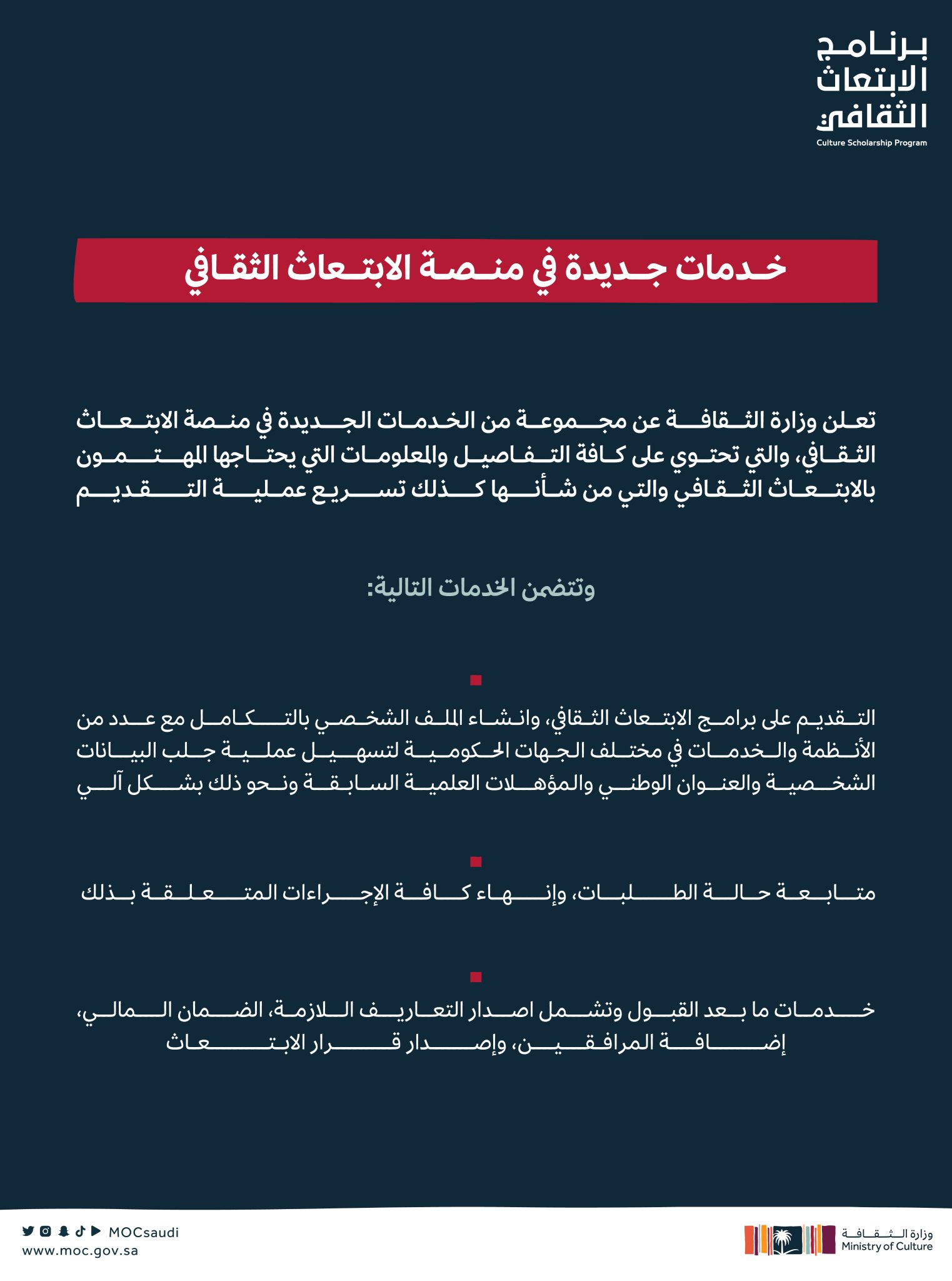 أعلنت وزارة الثقافة عن مجموعة من الخدمات الجديدة في منصة الابتعاث الثقافي، التي تحتوي على التفاصيل والمعلومات التي يحتاجها المهتمون بالابتعاث الثقافي كافة، إضافةً إلى احتوائها على محتوىً توعوي عن الابتعاث الثقافي، مع إمكانية التحكم به وإدارته، حيث ستُمكّن المنصة عبر الرابط الإلكتروني: https://scholarship.moc.gov.sa ، الطالب من التقديم على برامج الابتعاث الثقافي، ومتابعة طلباته، وإنهاء كافة الإجراءات المتعلقة بذلك .