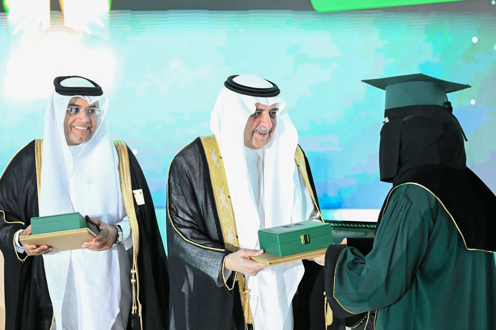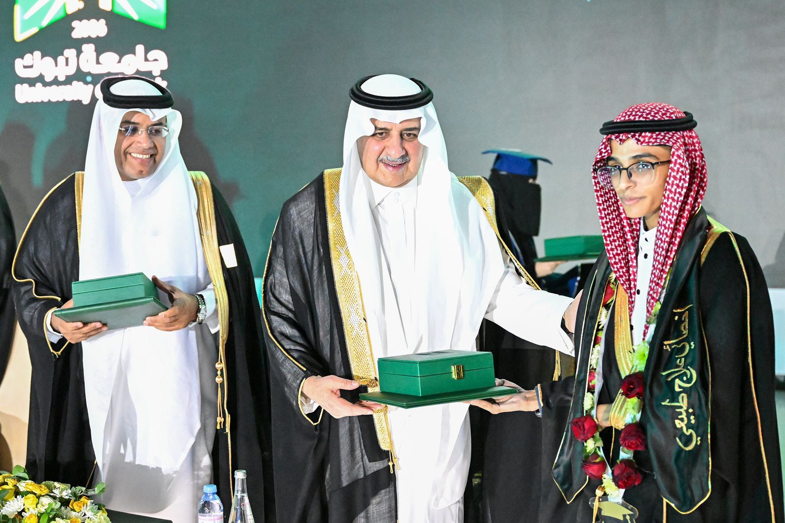 ثم قام سمو أمير منطقة تبوك بتسليم شهادات التخرج لأوائل الخريجين والخريجات، مباركًا لهم ولأولياء أمورهم ومعلميهم وجامعاتهم.