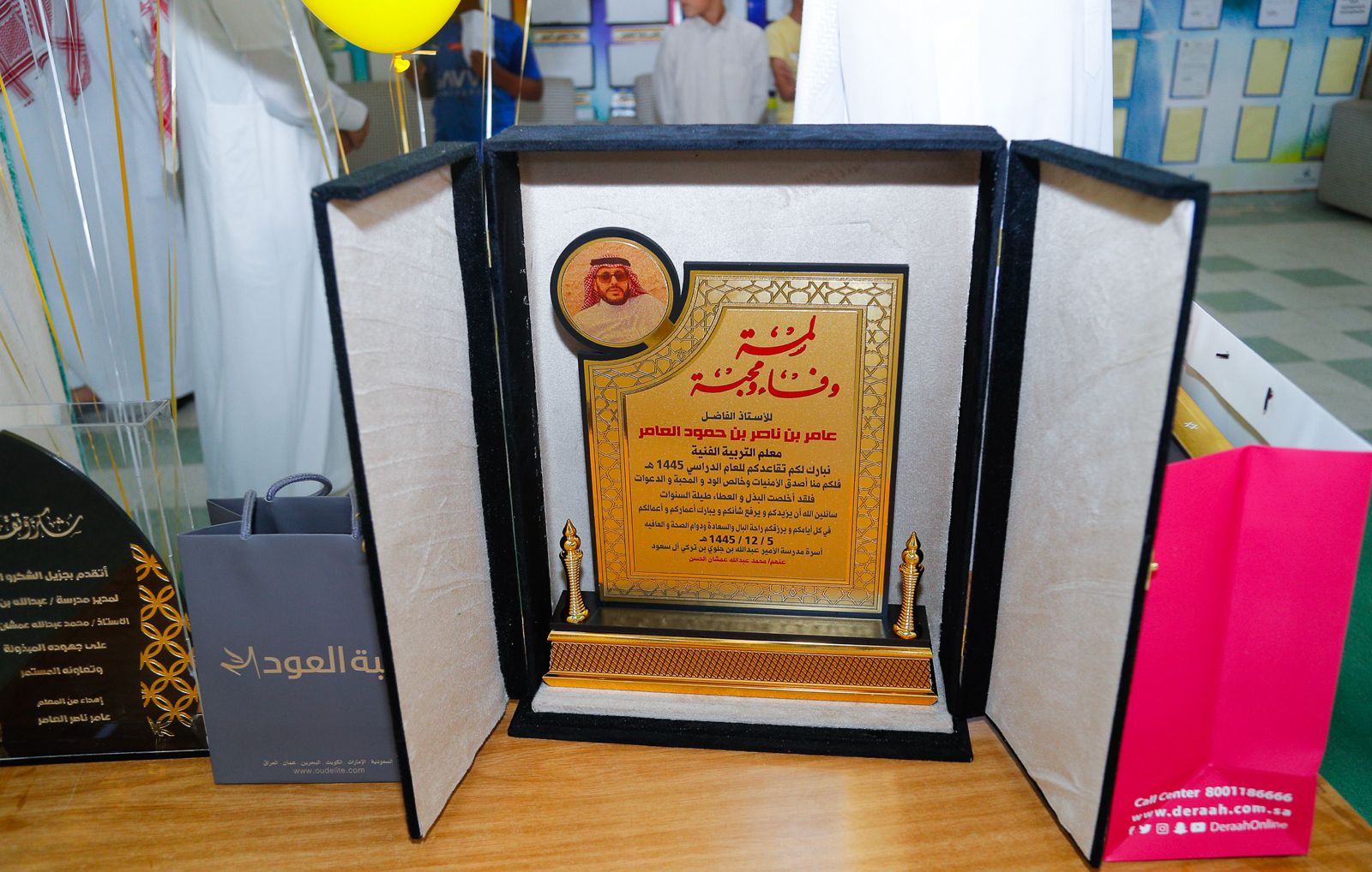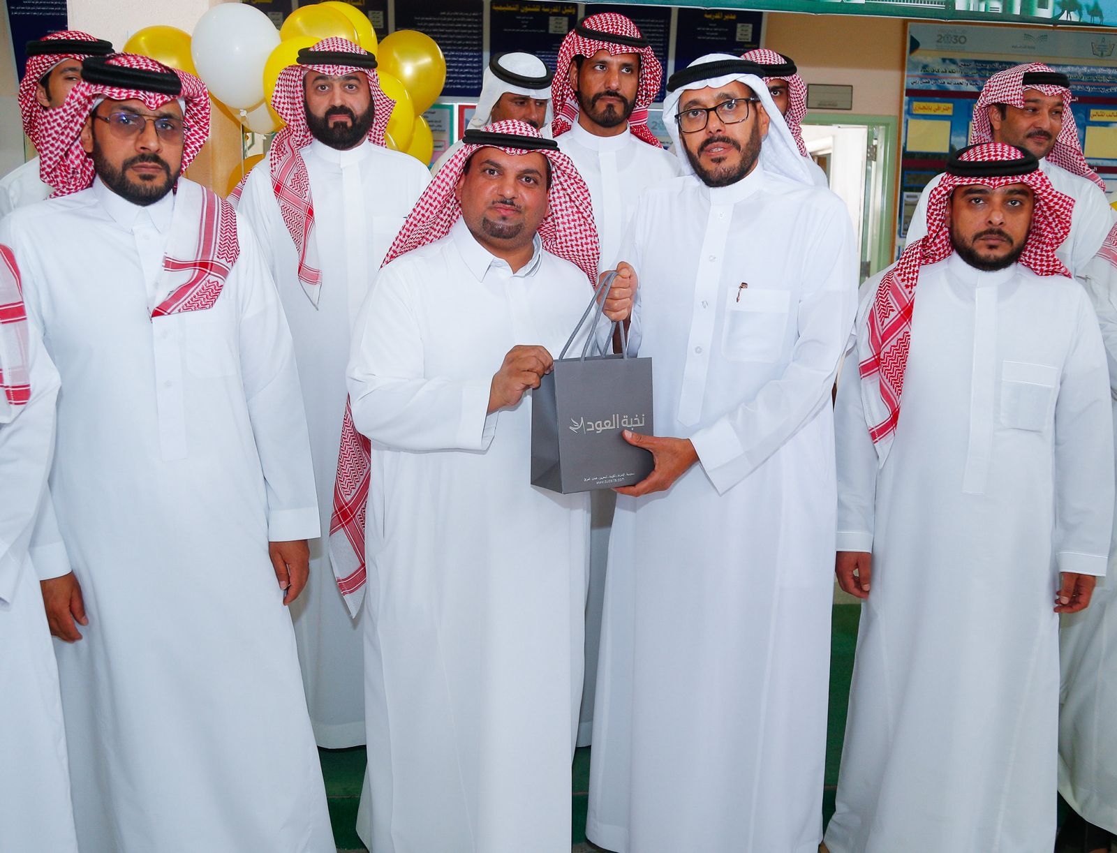 وبدأ التكريم مع الطابور الصباحي بالمدرسة وذلك بحضور مدير مكتب التعليم الأستاذ عبدالله بن سلمان الزارع، و رئيس فريق التقويم الذاتي بالمكتب الأستاذ عبدالله المشعل، وأعضاء الفريق الأستاذ فهد الجديع، والأستاذ عاطف الحسن، والأستاذ عبدالله الريس، و مدير المدرسة الأستاذ محمد عبدالله عمشان الحسن، وزملاءه المعلمين والإداريين و المدعوين .