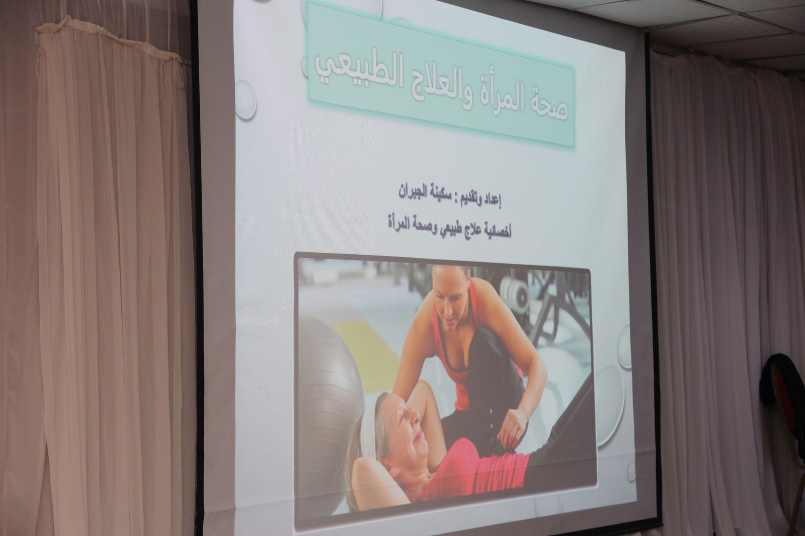وقد تناولت الجبران خلال المحاضرة العديد من المحاور منها: علاقة صحة المرأة والعلاج الطبيعي - المشاكل الطبية المتعلقة بمنطقة الحوض والأعراض المصاحبة سواء كانت هبوط أو سلس أو آلام في أسفل الحوض، حيث يمكن للعديد من العوامل إضعاف عضلات قاع الحوض منها: الحمل والولادة والجراحة والشيخوخة والإجهاد المفرط أو السعال المزمن والوزن الزائد.