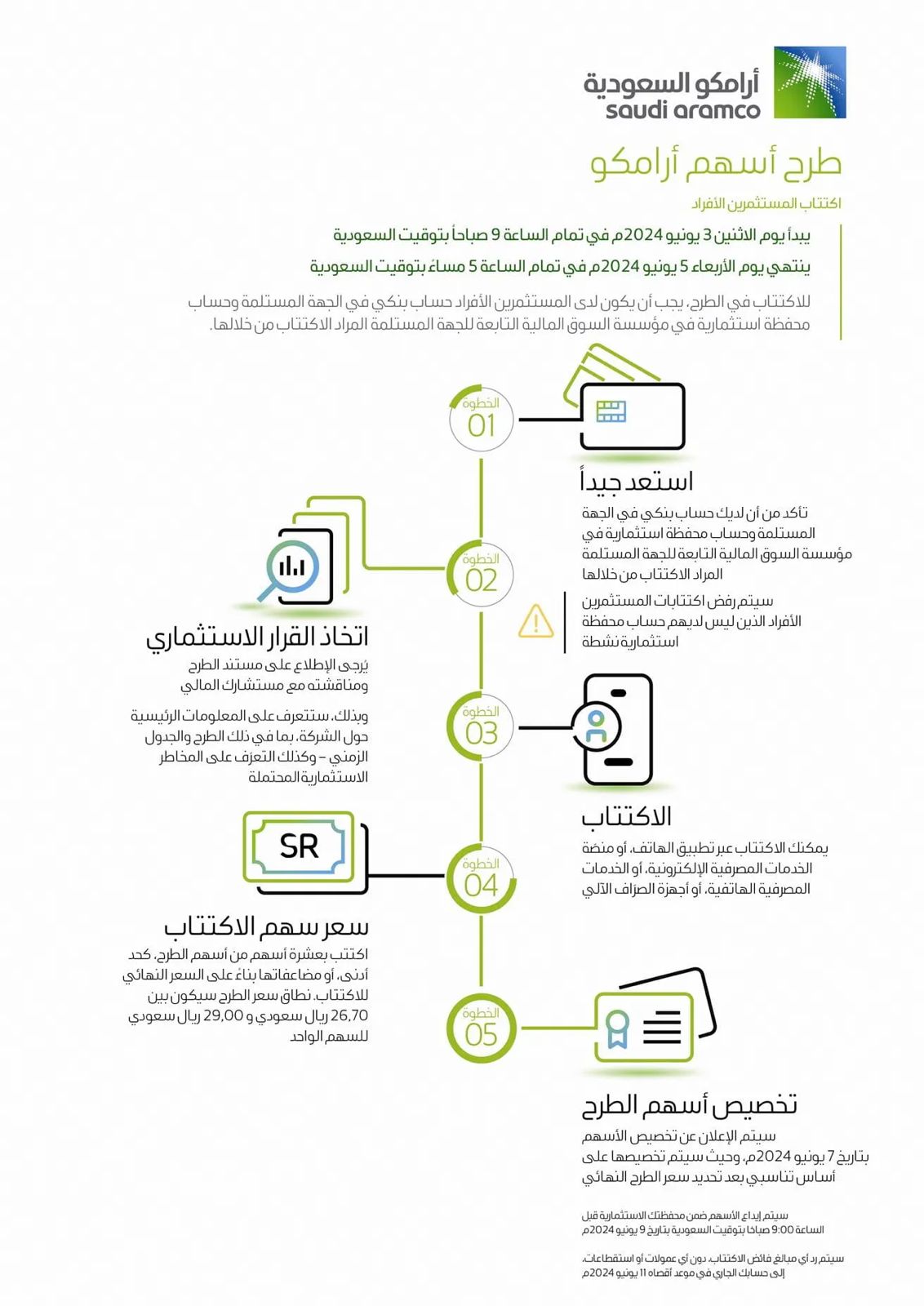 أعلنت اليوم كل من حكومة المملكة العربية السعودية وأرامكو السعودية عن إطلاق عملية الطرح العام الثانوي لأسهم عادية لشركة أرامكو السعودية.