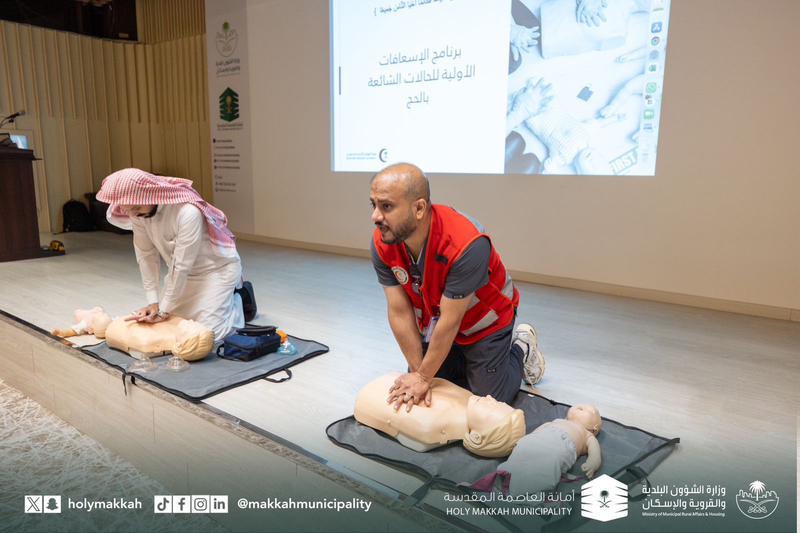 وتناقش الورش عدة محاور حول إسعافات الطوارئ والتعامل مع الأزمات بالتعاون مع هيئة الهلال الأحمر السعودي؛ لتدريب المشاركين على قواعد الإسعافات الأولية الضرورية، وتمكينهم من تقديم المساعدة الفورية في حال وقوع أي طارئ صحي.