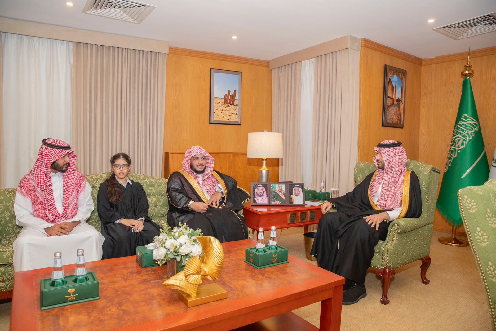 كرم صاحب السموّ الملكيّ الأمير متعب بن مشعل بن بدر بن سعود بن عبدالعزيز نائب أمير منطقة الجوف، في مكتبه اليوم، الطالبة ريم بنت عادل الحارثي يرافقها والدها، لحصولها على المركز الأول في مسابقة الأمير سلطان بن سلمان بن عبدالعزيز للقرآن الكريم للأطفال ذوي الإعاقة.