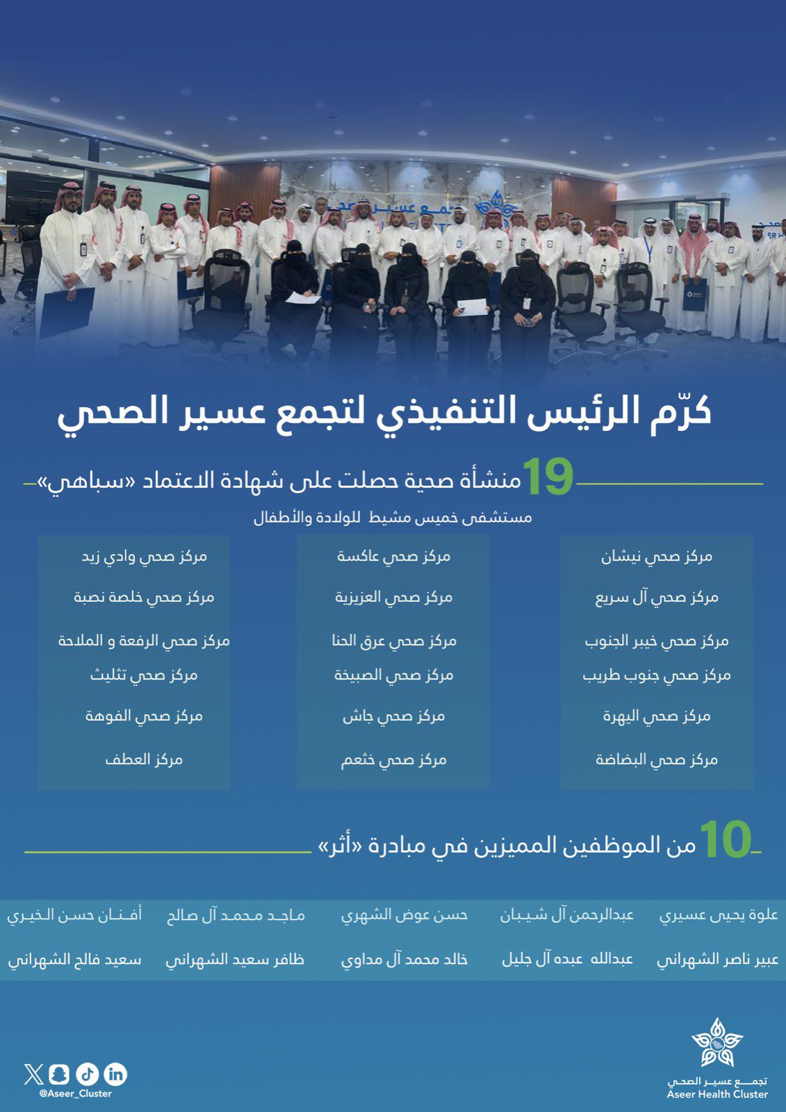 كرّم الرئيس التنفيذي لتجمّع عسير الصحي الدكتور إبراهيم العريفي، 19 منشأة صحية حصلت على شهادة الاعتماد «سباهي» تضمنت : مستشفى خميس مشيط للولادة والأطفال، والمراكز الصحية التالية: العزيزية بأبها، وآل سريع بأبها، وخيبر الجنوب بخميس مشيط، والعطف ببيشة، وخثعم ببلقرن، والبضاضة ببلقرن، والفوهة ببلقرن، وتثليث، وجاش بتثليث، واليهرة بتثليث، والصبيخة بتثليث، وعرق الحناء بأحد رفيدة، ونيشان بالنماص، وعاكسة بالنماص، ووادي زيد بالنماص، والرفغة والملاحة بالحرجة، وجنوب طريب بالمضة، وخلصة نصبه ببارق.