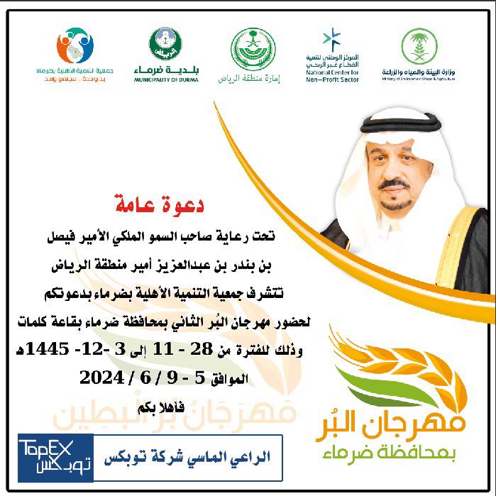 برعاية صاحب السمو الملكي الأمير فيصل بن بندر بن عبدالعزيز آل سعود، افتتح محافظ محافظة ضرماء المكلف هزاع بن ناصر بن قرملة، مهرجان البر الثاني لعام 1445هـ بقاعة كلمات بالمحافظة مساء أمس الأربعاء الموافق ١٤٤٥/١١/٢٨هـ ويستمر لمدة خمسة أيام، والذي تقيمه جمعية التنمية الأهلية بمحافظة ضرماء للعام الثاني على التوالي وبإشراف مكتب البيئة والمياه والزراعة بمحافظة ضرماء.
