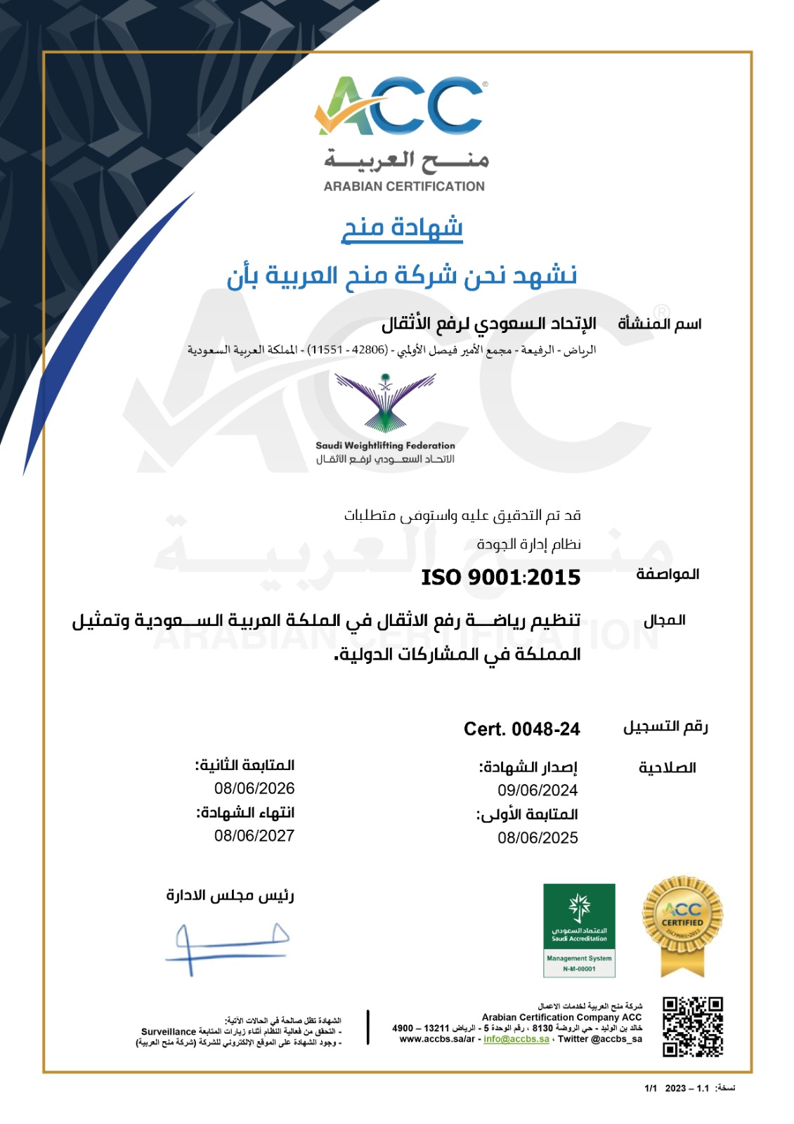 وقد حصل الاتحاد السعودي لرفع الاثقال على هذه الشهادة من شركة منح العربية وهي شركة وطنية رائدة والأولى في مجالات أنشطة نظم الإدارة وأنظمة منح الشهادات والمطابقة والتفيش، وتقدم ACC خدماتها للسوق المحلي والإقليمي بقدرات وخبرات ومهنية عالية في هذه الأنظمة المتخصصة والمبتكرة بهدف الربح ورفع الكفاءة، إذ تساعد مختلف المنظمات على التعلم وتطوير الفرص والتنمية الذاتية لتحقيق الريادة، والقدرة التنافسية، والنجاح محلياً، وخارجياً، وذلك بعد أن نفذ ممثل المنظمة مراجعة دقيقة وتفصيلية لنظام الجودة في تنظيم رياضة رفع الأثقال وآليات إجراءات العمل المتبعة داخل الاتحاد، إضافة إلى إجراء عدد من الزيارات الميدانية والمقابلات مع الموظفين المسؤولين عن تنفيذ هذه الإجراءات وعمل العديد من الدورات التدريبية لهم .