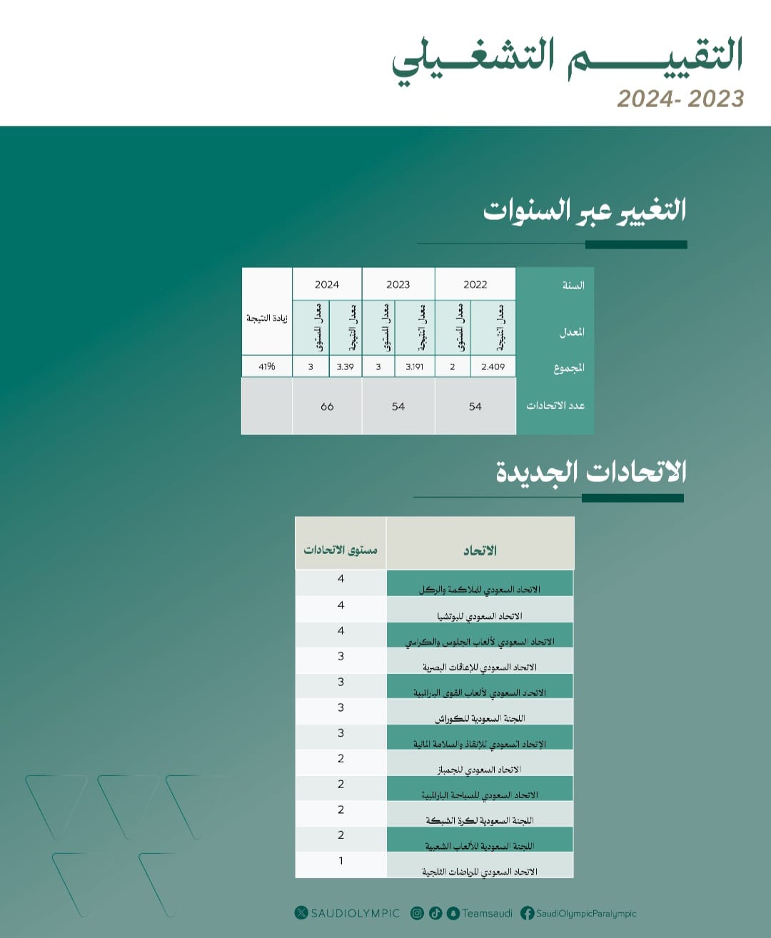 وسجلت نتائج التقييم، زيادة ملحوظة في معدل التطور التشغيلي، الذي قفز إلى 41% في الاتحادات واللجان الـ66 المشمولة في الاستراتيجية.