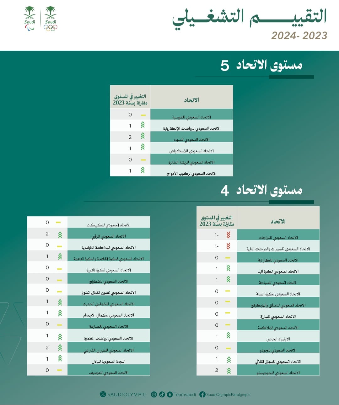 أعلنت اللجنة الأولمبية والبارالمبية السعودية نتائج التقييم التشغيلي الأول لعام 2024م الخاص باستراتيجية دعم وتطوير الاتحادات الرياضية للفترة الزمنية من مارس 2023م وحتى شهر مارس للعام الحالي بعد تدشينها في نوفمبر 2021م بميزانية تقدر بمليارين و600 مليون ريال سعودي كإحدى مبادرات برنامج جودة الحياة الرامية لإحداث نقلة تطويرية في الاتحادات الرياضية السعودية.