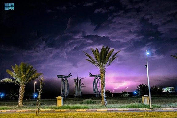ارتسمت في سماء مدينة الباحة مساء اليوم لوحة من الجمال الرباني، حيث أضاء البرق سماءها وسط زخات المطر التي ارتوت بها أرضها ، فيما أعطى الضباب الذي عانق جبالها المزيد من الأجواء الساحرة الخلابة.