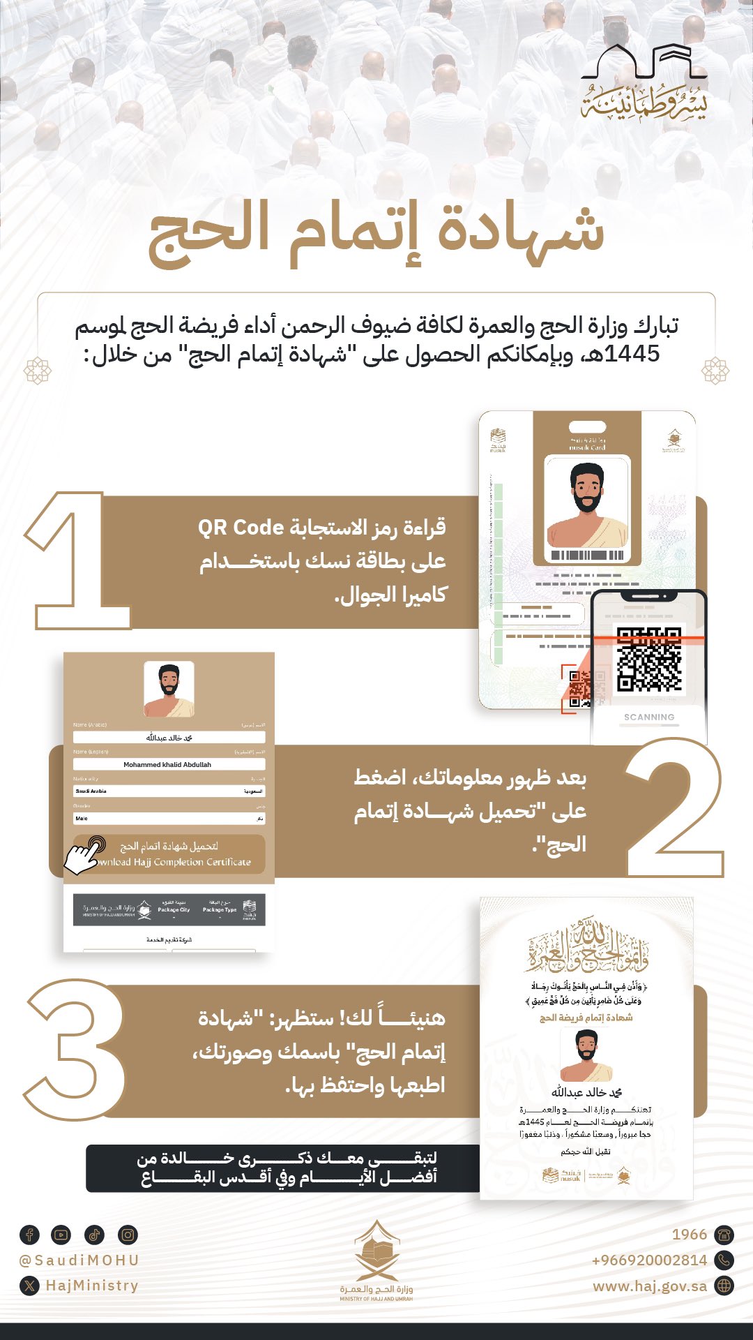 - هنيئا لك ستظهر شهادة "إتمام الحج" بإسمك وصورتك اطبعها واحتفظ بها لتبقى معك ذكرى خالدة من أفضل الأيام وفي أقدس البقاع