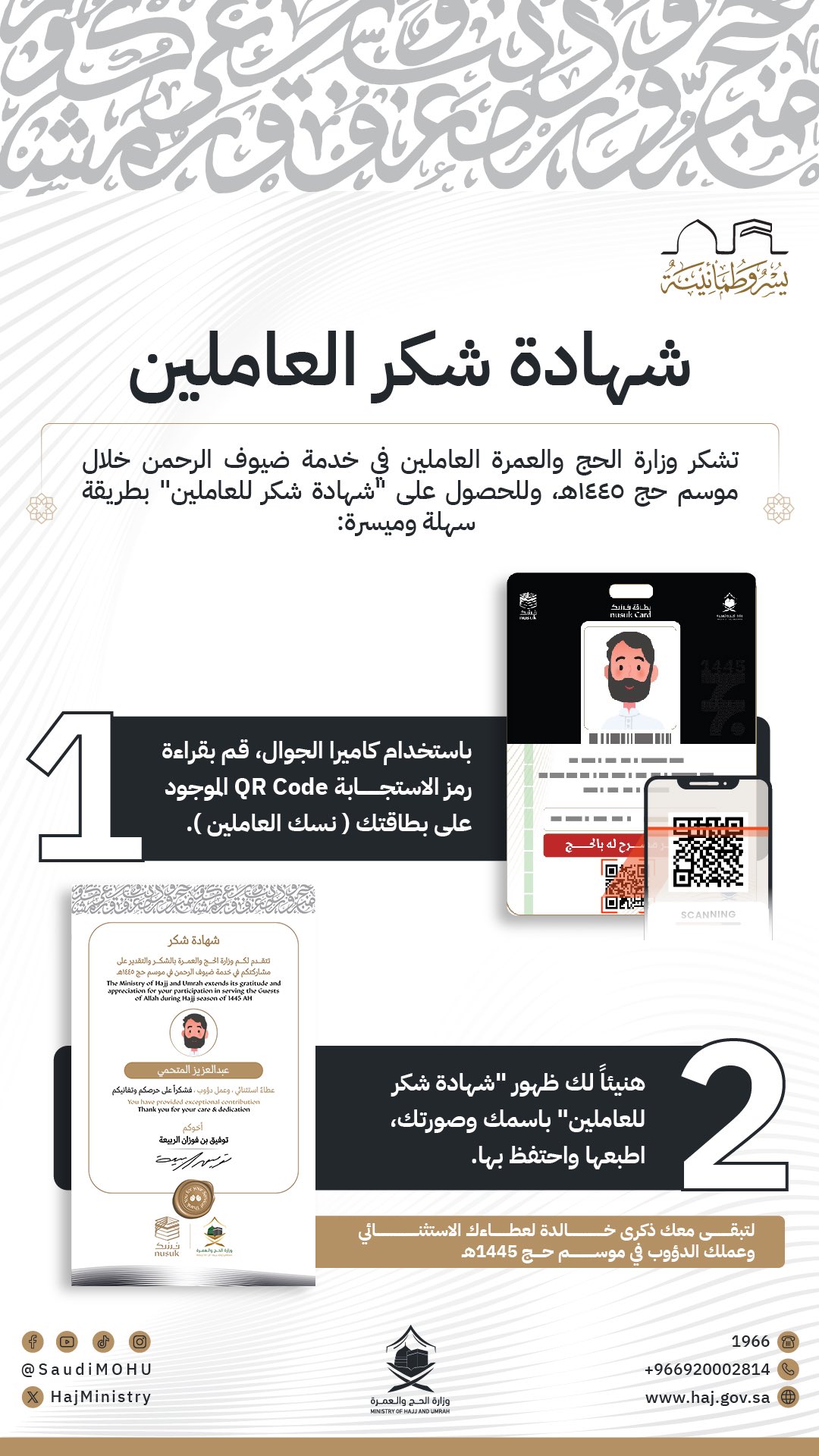 طريقة الحصول على شهادة شكر العاملين في خدمة ضيوف الرحمن خلال موسم الحج كالتالي: