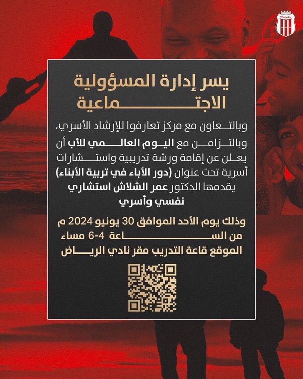 يُقيم مركز تعارفوا للإرشاد الأسري وبالتعاون مع نادي الرياض السعودي ممثلاً بادارة المسؤولية المجتمعية ، بمناسبة يوم الأب العالمي، ورشة تدريبيه عن دور الأباء في تربية الأبناء وذلك يوم الاحد الموافق