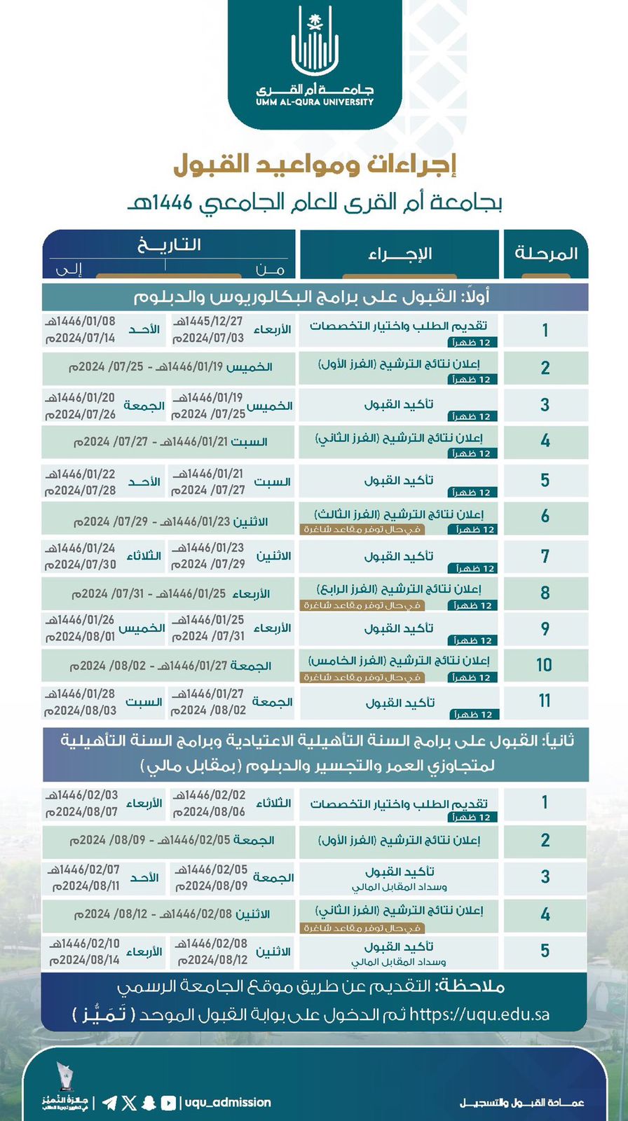 بدأت جامعة أم القرى اليوم , استقبال طلبات القبول على برامج البكالوريوس والدبلوم وبرنامج المنح الداخلية للعام الجامعي 1446هـ عبر بوابة القبول الموحد تَـمَـيـُّـز.