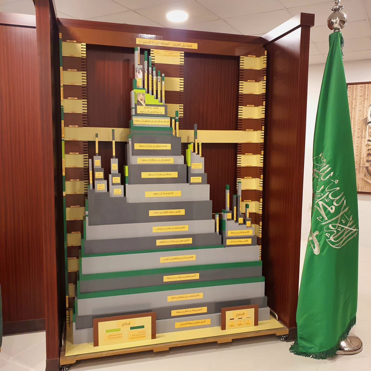 وأوضح المهندس خالد العبدالله - الحاصل على ماجستير في هندسة الكمبيوتر من جامعة الملك فهد للبترول والمعادن والمتقاعد من شركة ارامكو السعودية – أن المجسّم التاريخي يحكي تاريخ حكّام المملكة العربية السعودية من تاريخ 1447م بإمارة الدرعية ومن ثم  الدولة السعودية  الأولى مرورا بالدولة السعودية الثانية إلى زماننا الحاضر.