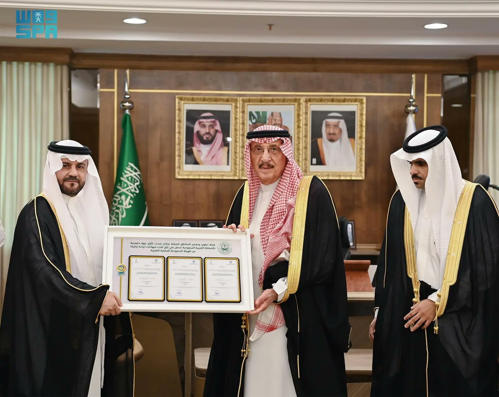 وهنأ سموه خلال الاستقبال، رئيس الهيئة ومنسوبيها، بمناسبة حصول الهيئة على أول ثلاث شهادات "براءة نباتية" من الهيئة السعودية للملكية الفكرية لأصناف البن السعودي الواعدة التي تم اكتشافها بالمناطق الجبلية، وهي أول جهة حكومية بالمملكة تحقق هذا الإنجاز، والذي يتزامن مع الإستراتيجية الوطنية للملكية الفكرية التي أطلقها سمو ولي العهد -حفظه الله-، والهادفة لدعم الاقتصاد القائم على تنافسية الابتكار والإبداع والوصول إلى اقتصاد معرفي لتصبح المملكة رائدة في مجال توليد وإدارة واستثمار وحماية الملكية الفكرية.