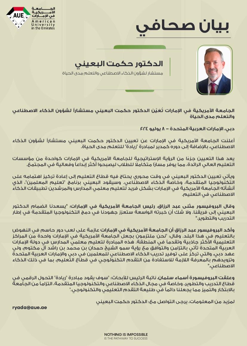 أعلنت الجامعة الأمريكية في الإمارات عن تعيين الدكتور حكمت البعيني مستشاراً لشؤون للذكاء الاصطناعي، بالإضافة إلى دوره كمدير لمركز "ريادة" للتعلم مدى الحياة.