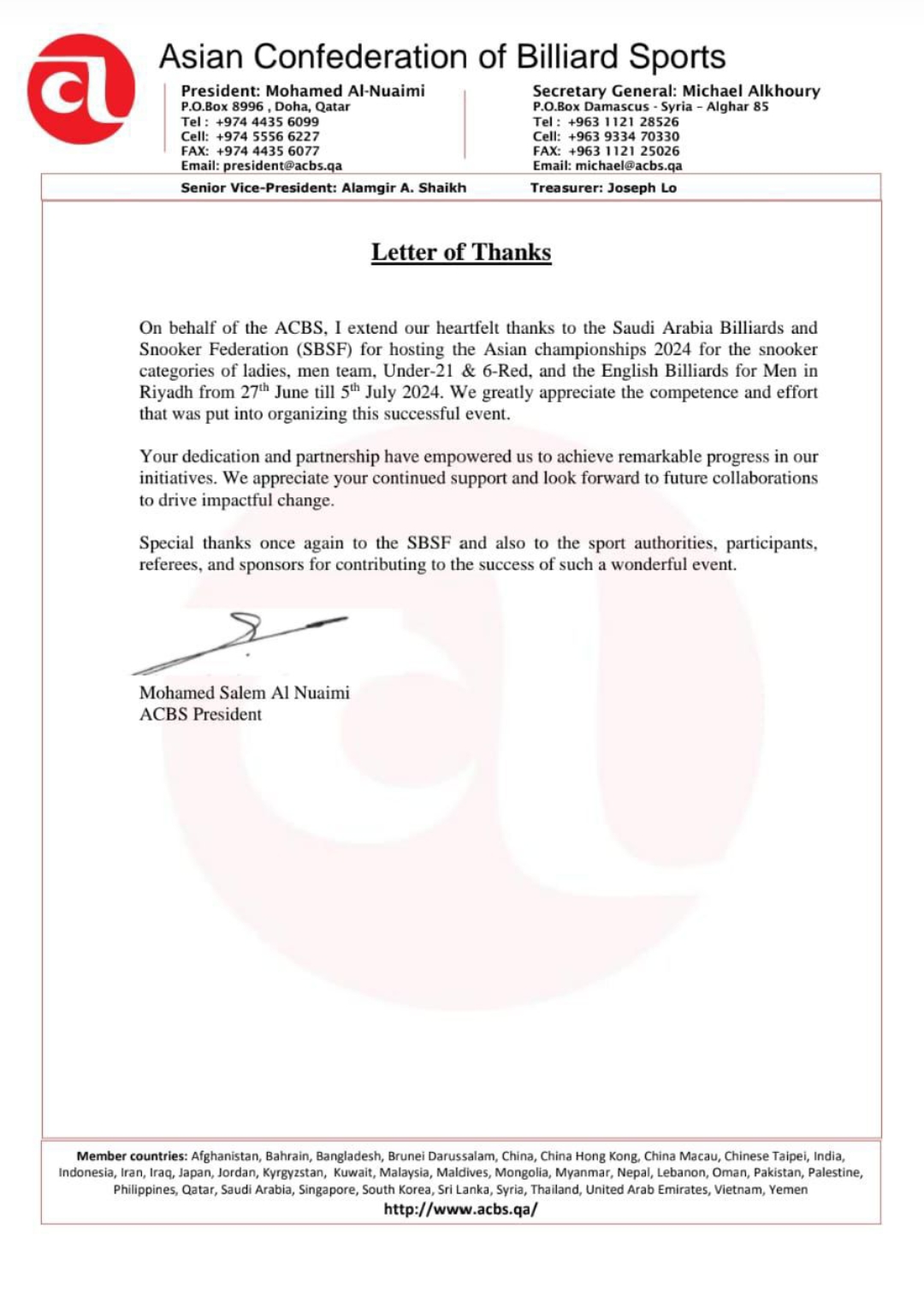 وأشار رئيس الاتحاد الآسيوي للبلياردو والسنوكر عبر خطاب شكر لرئيس الاتحاد السعودي للبلياردو والسنوكر الدكتور ناصر الشمري كان نصه " بالنيابة عن اعضاء الاتحاد الآسيوي للبلياردو والسنوكر أتقدم بالشكر الجزيل إلى المملكة العربية السعودية ممثلاً في الاتحاد السعودي للبلياردو والسنوكر لاستضافة بطولة آسيا 2024 للسنوكر في فئات السيدات، وفريق الرجال، وتحت 21 سنة، والبلياردو الإنجليزي للرجال بمدينة الرياض في الفترة من 27 يونيو حتى 5 يوليو 2024 ونحن نقدر بشدة الكفاءة والجهد التي تم وضعها في تنظيم هذا الحدث الناجح ولقد مكننا تفانيكم وشراكتكم من تحقيق تقدم ملحوظ في أعمالنا ومبادرتنا ونحن نقدر دعمكم المستمر ونتطلع إلى التعاون في المستقبل لقيادة التغيير المؤثر ونقدم شكر خاص مرة أخرى للاتحاد السعودي لكرة القدم وأيضا للسلطات الرياضية والمشاركين والحكام والرعاة للمساهمة في نجاح مثل هذا الحدث الرائع".