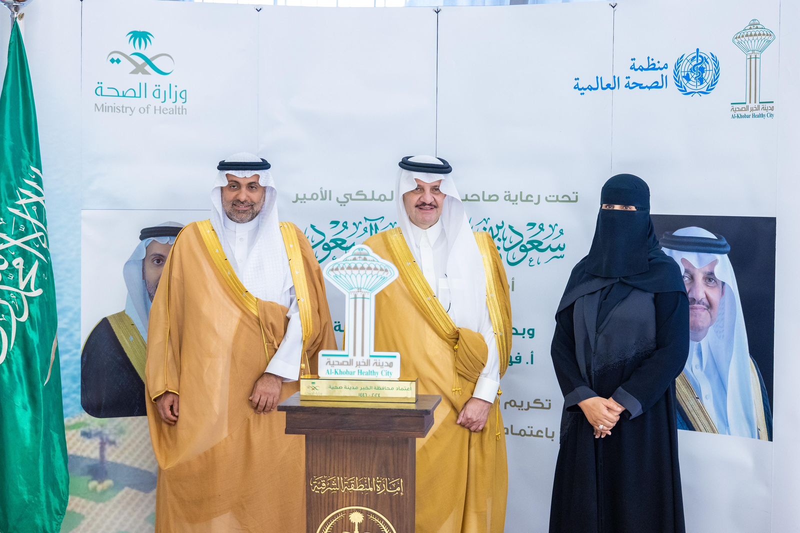 وتسلم سمو أمير المنطقة الشرقية من معالي وزير الصحة شهادة اعتماد محافظة الخبر كمدينة صحية من منظمة الصحة العالمية، بالإضافة إلى تكريم الداعمين للقطاع الصحي في المنطقة الشرقية.