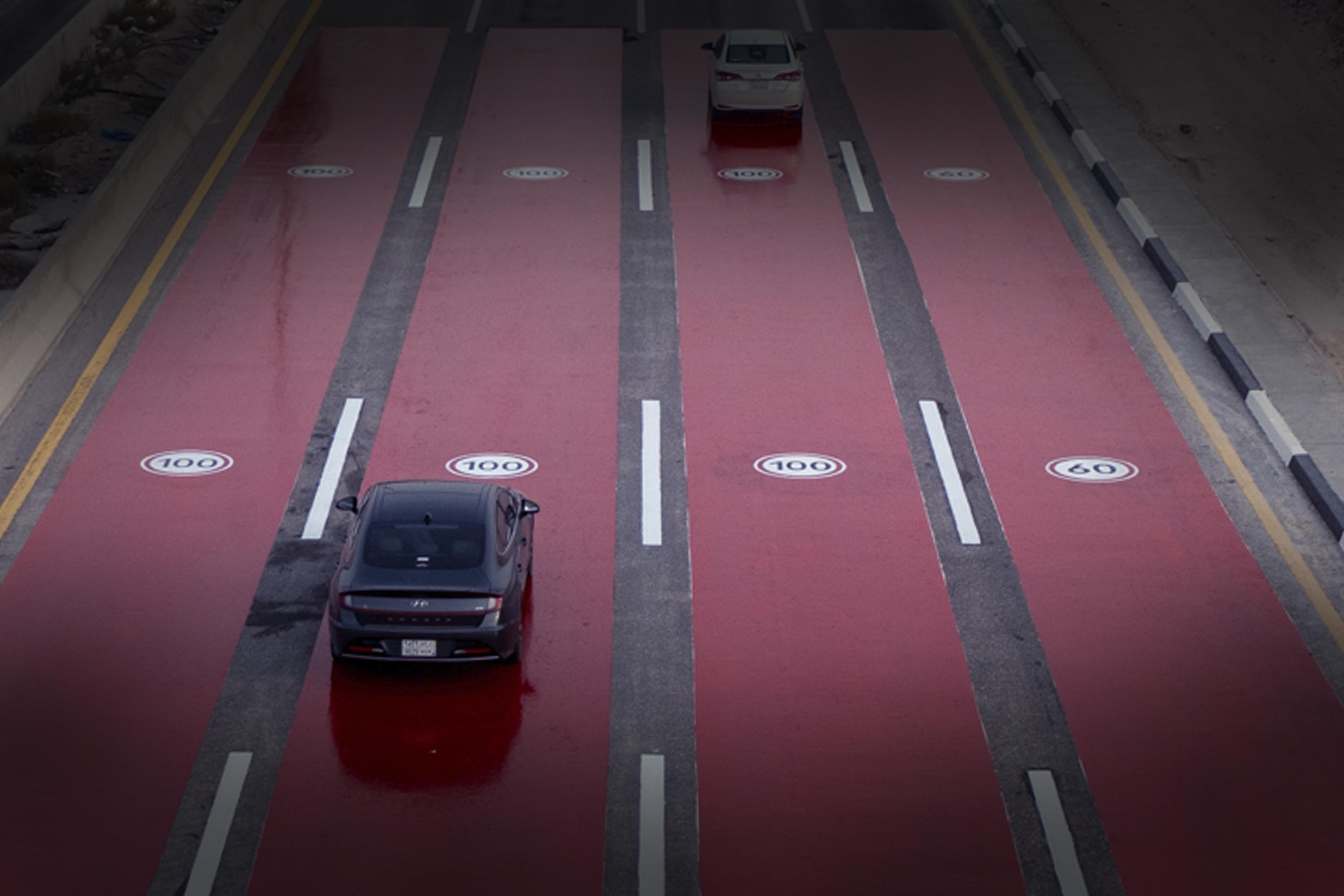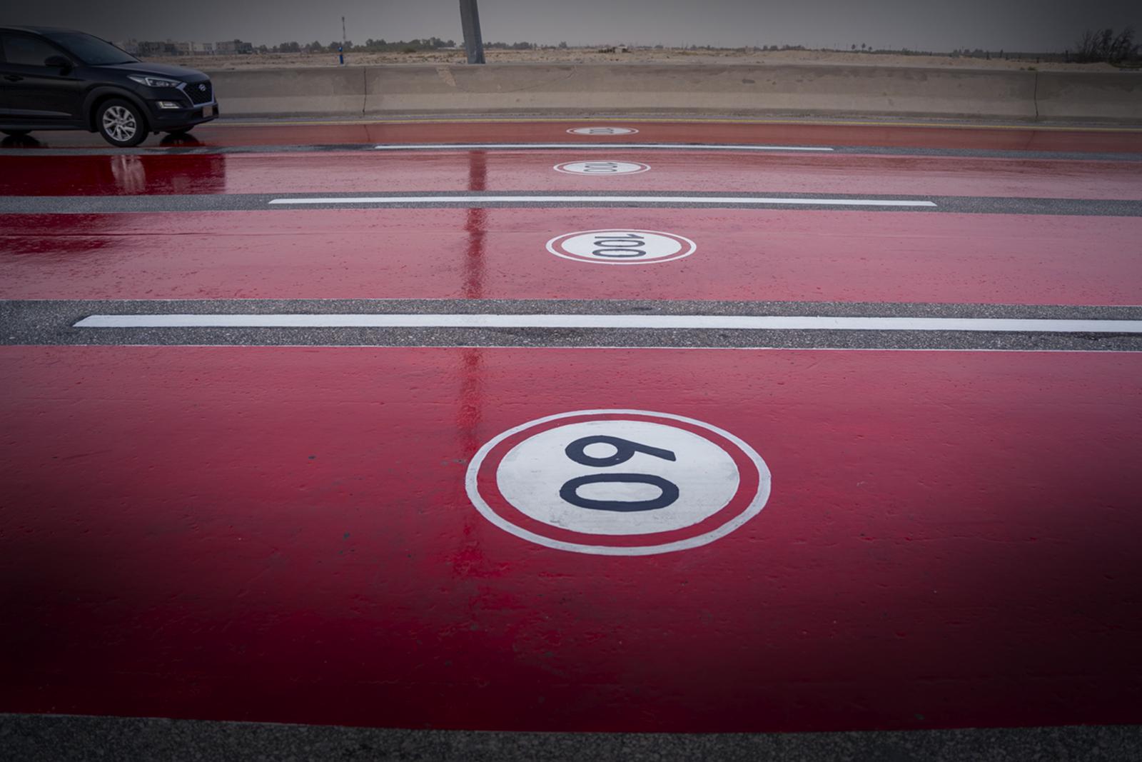 يُذكر أن الموقع المُحدد بهذه الخاصية في الطريق يتشكل من مجموعة من عناصر السلامة والعلامات المرورية الأرضية ويتضمن ذلك ( علامات مسبقة الصنع لـ" حد السرعة الجديدة "، مسار دهان احمر بارد ثنائي المُكون ).