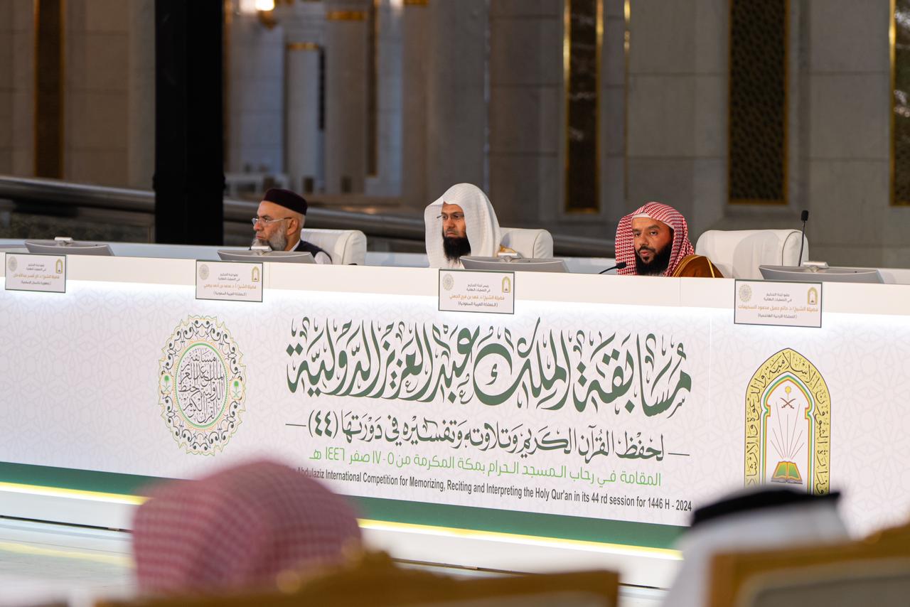 تحت رعاية خادم الحرمين الشريفين الملك سلمان بن عبدالعزيز آل سعود -حفظه الله-، افتتح معالي وزير الشؤون الإسلامية والدعوة والإرشاد الشيخ الدكتور عبداللطيف بن عبدالعزيز آل الشيخ المشرف العام على مسابقة القرآن الكريم المحلية والدولية، اليوم السبت السادس من شهر صفر لعام 1446هـ، التصفيات النهائية لمسابقة الملك عبدالعزيز الدولية لحفظ القرآن الكريم وتلاوته وتفسيره في دورتها الـ(44) التي تنظمها الوزارة في رحاب المسجد الحرام، بمشاركة 173 متسابقاً يمثلون 123 دولة، في أكبر تجمع لحفظة كتاب الله من مختلف قارات العالم يتنافسون على نيل جوائز هذه المسابقة التي تمثل درة المسابقات العالمية، حيث تستمر التصفيات النهائية للمسابقة ستة أيام على فترتين صباحية ومسائية ويشارك في تحكيمها نخبة من المحكمين الدوليين.