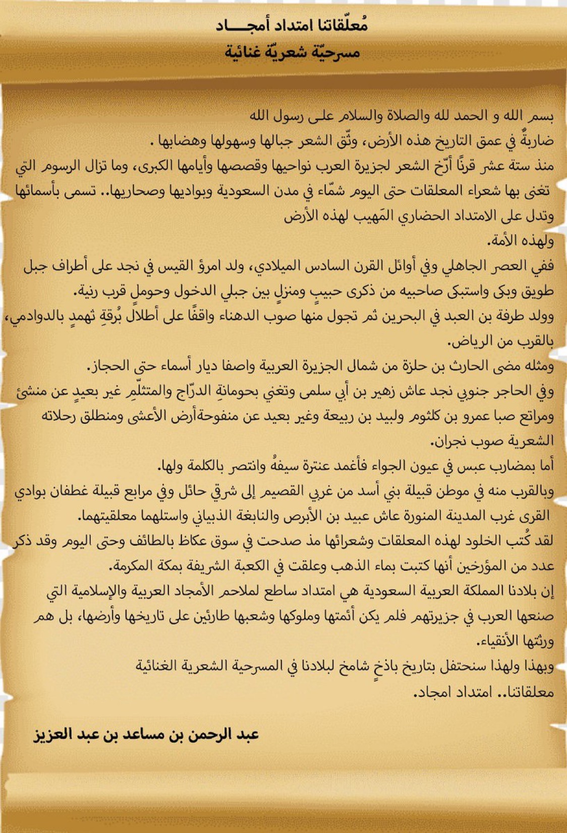 أكد الأمير عبدالرحمن بن مساعد بن عبدالعزيز المشرف العام على المسرحية الغنائية "معلقاتنا امتداد أمجاد" وصاحب فكرتها، اهتمام القيادة بترسيخ الثقافة السعودية ودعم جهود القطاع الثقافي.