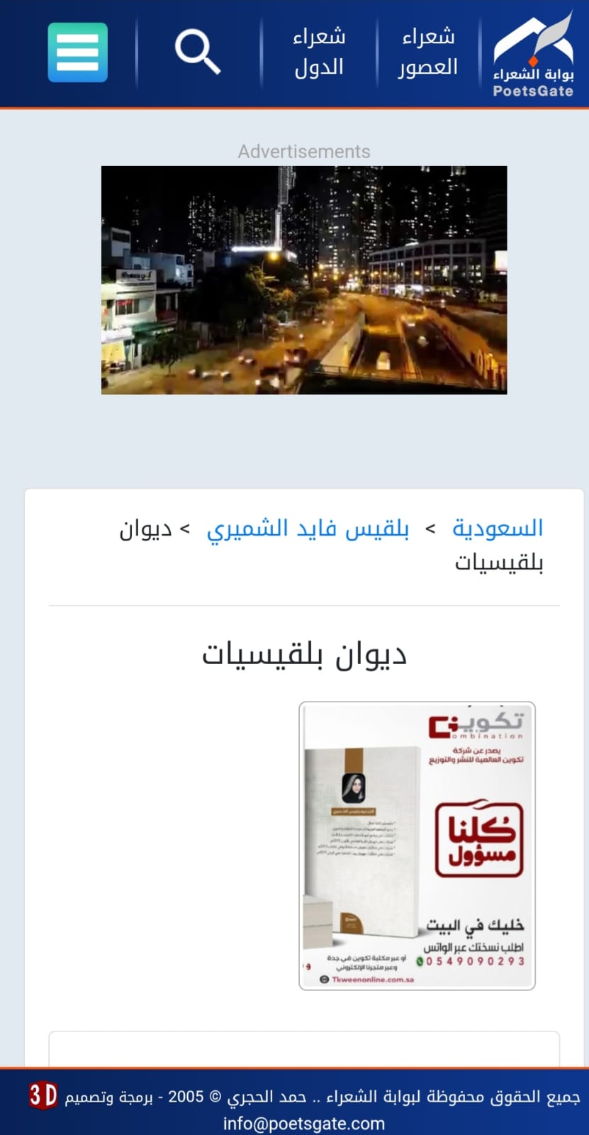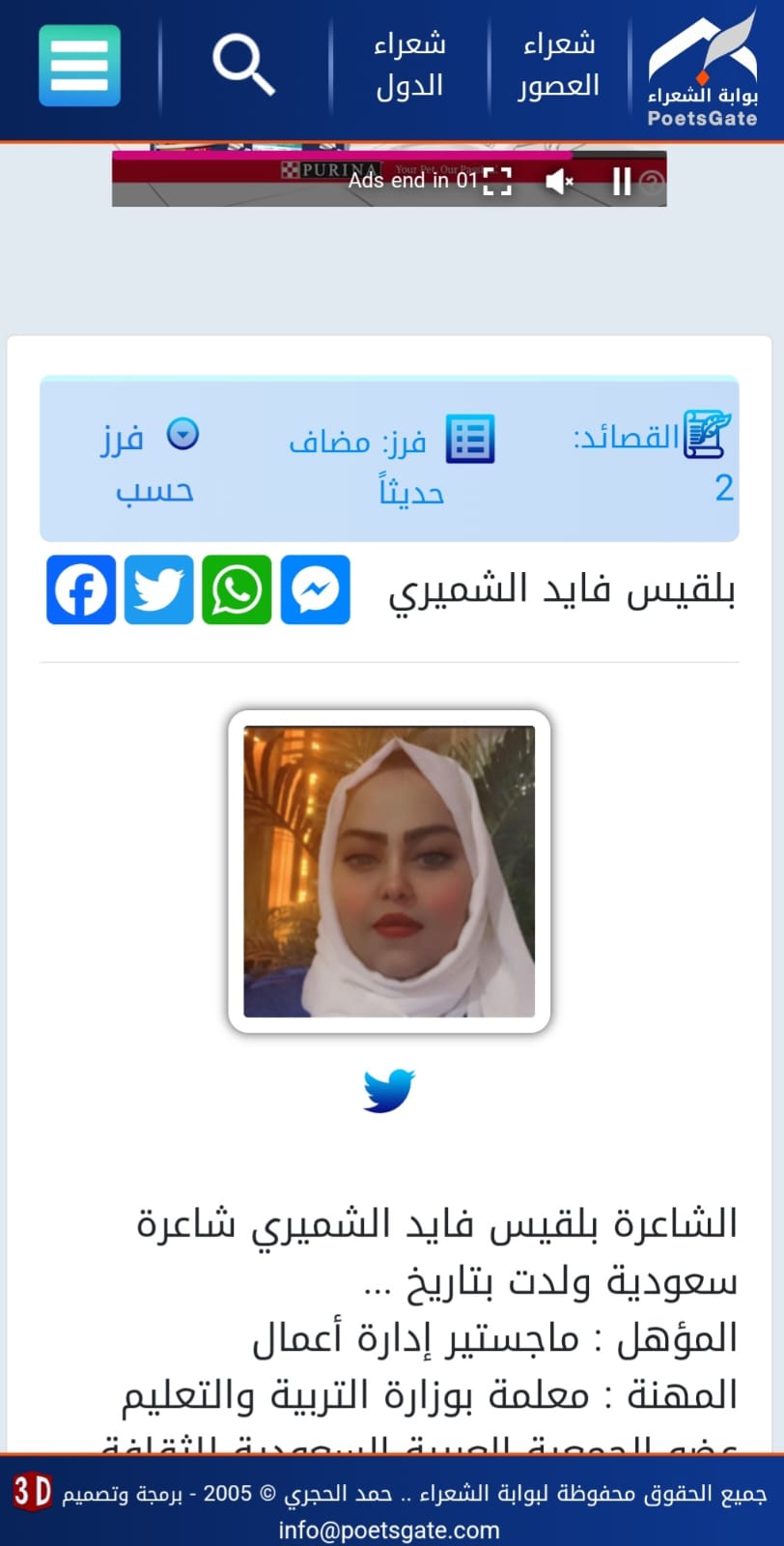 تم تسجيل إسم الأديبة السعودية الشاعرة بلقيس الشميري بموسوعة الشعر العربي "بوابة الشعراء" بموقعها الرسمي على شبكة الإنترنت وتم تدوين سيرتها الذاتيه وقصائدها الشعرية وتعد هذه الموسوعة من أهم المصادر والمراجع الرصينة الموثوق بها في تدوين الشعر العربي بكل مراحله منذ العصر الجاهلي حتى عصر الشعر الحديث وصحيفة النهار السعودية تبارك للشاعرة المجيدة بلقيس تدوين سيرتها وشعرها بديوان العرب من خلال هذه الموسوعة وهي تستحق ذلك لجودة شعرها وغزارة إنتاجها وإصداراتها المتلاحقة لدواوينها الشعرية والتي دائما ما تخص بها صحيفتنا الغراء