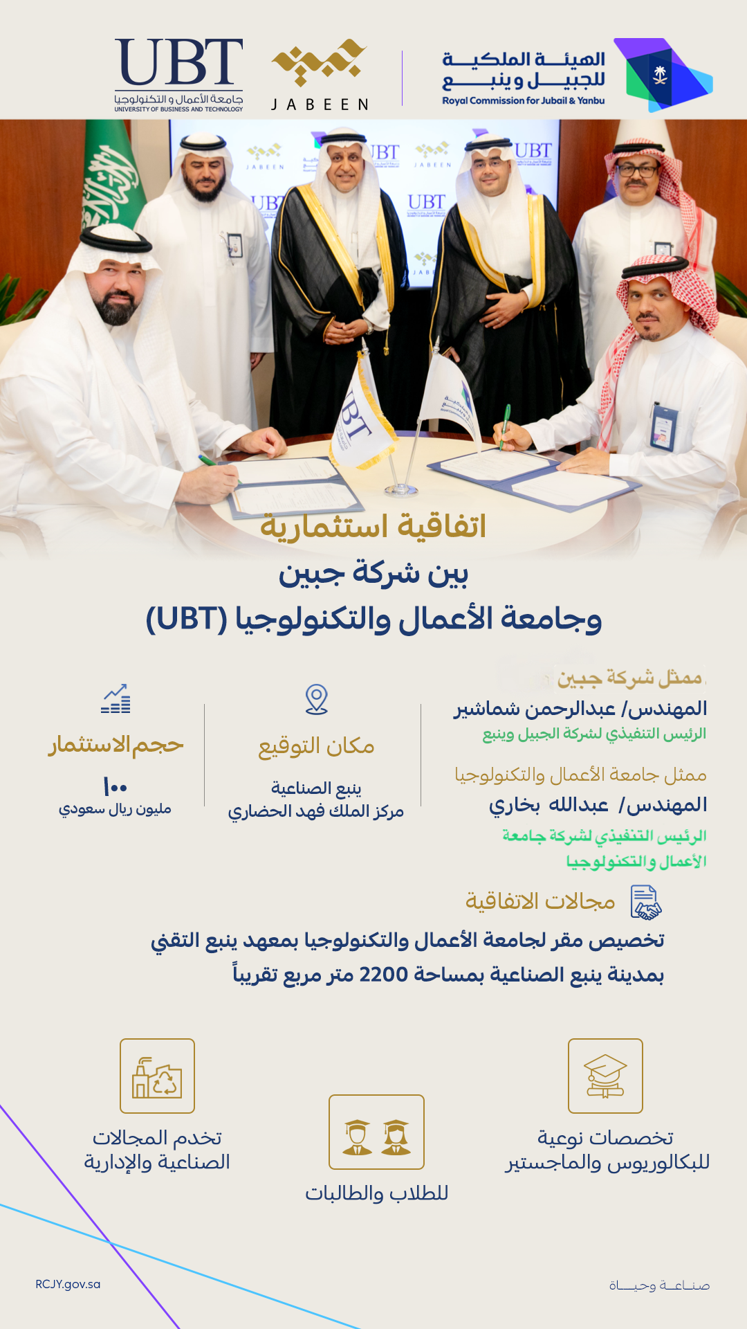 ضمن خطى طموحة لجامعة الأعمال والتكنولوجيا نحو تعزيز التوسع الأكاديمي والمساهمة في تنمية الكوادر الوطنية، ومواجهة تحديات ومتطلبات سوق العمل، وبعد النجاحات الكبيرة التي حققتها الجامعة في مسيرتها التعليمية، توقع الجامعة اتفاقية إستراتيجية مع شركة الجبيل وينبع لخدمات المدن الصناعية (جبين)، وتعتبر ذراع التمكين الاستراتيجي للهيئة الملكية للجبيل وينبع في مدنها (الجبيل، ينبع، رأس الخير، جازان)، حيث تهدف الاتفاقية إلى تقديم الخدمات التعليمية بمدينة ينبع الصناعية وما حولها من مدن.