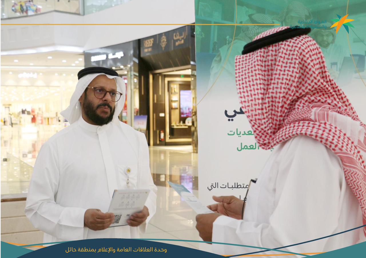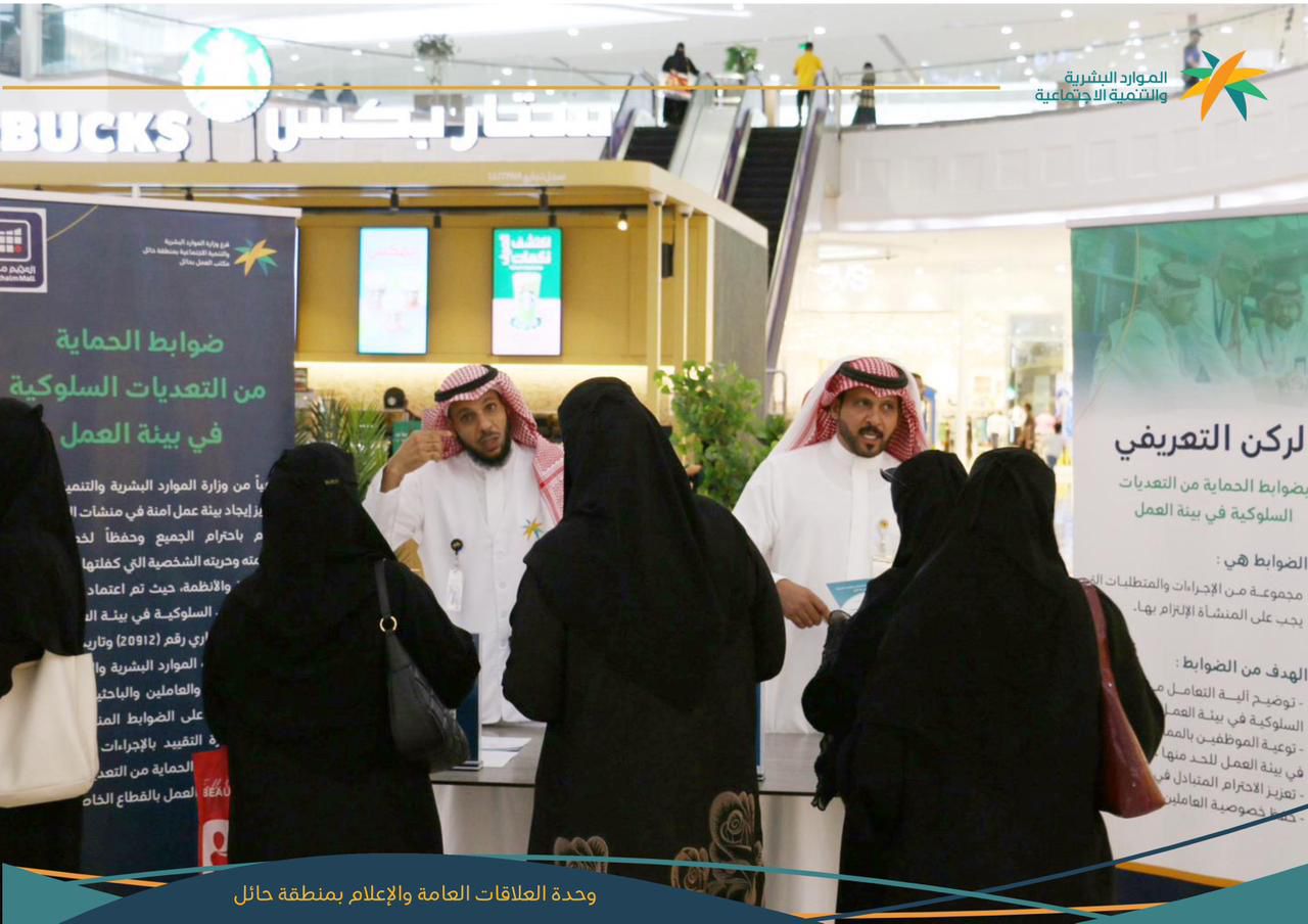 بإشرافٍ ومتابعةٍ من سعادة مدير مكتب العمل بمنطقة حائل علي النبري ، أقام المكتب ركناً تعريفياً في أحد المجمعات التجارية بالمنطقة للتعريف بضوابط الحماية من التعديات السلوكية في بيئة العمل ، وقد عمل في هذا الركن خبراء التعديات السلوكية بالمنطقة من نُخبةِ موظفي مكتب العمل وهم سلطان العنزي وخالد الشمري وأحمد العنزي .