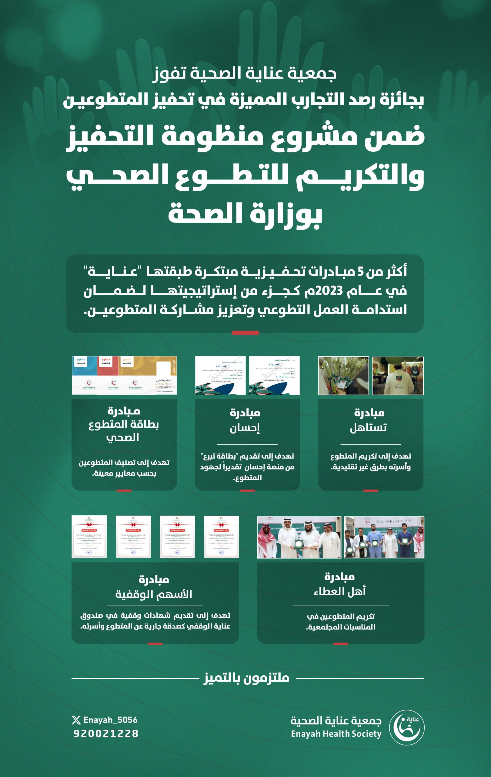 فازت جمعية عناية الصحية بجائزة التطوع الصحي ضمن مبادرة رصد التجارب المميزة في تحفيز المتطوعين الصحيين التي تطلقها منصة التطوع الصحي بوزارة الصحة في إطار مشروع منظومة التحفيز والتكريم للتطوع الصحي، وتهدف هذه المبادرة إلى تكريم الجهات المميزة في مجال تحفيز المتطوعين الصحيين لعام 2023، وتستهدف الجهات الحكومية والمؤسسات غير الربحية.