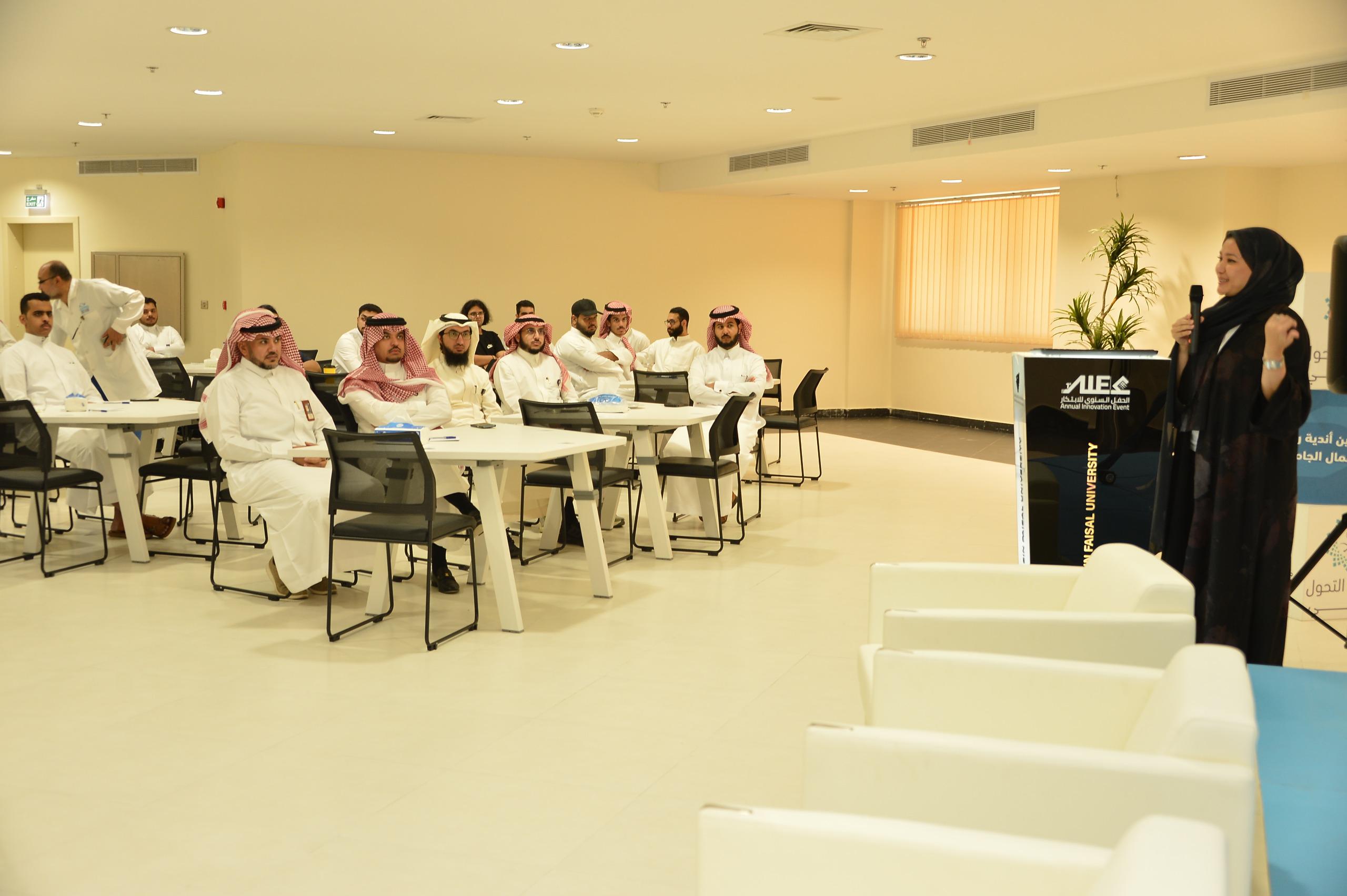 عقد معهد الابتكار وريادة الاعمال بجامعة الامام عبد الرحمن بن فيصل اللقاء التعريفي للمعهد مستهدفًا وكلاء الكليات للبحث العلمي والابتكار وأعضاء هيئة التدريس والهيئة الإدارية والطلبة من المهتمين في مجال الابتكار وريادة الأعمال وذلك في بهو المعهد بالمدينة الجامعية بحضور عميدة المعهد الدكتورة خلود الغامدي، والدكتور خالد الحركان والدكتور محمد الشيخ والدكتورة تهاني فلمبان ، و مدير عام المركز الجامعي للاتصال والإعلام الدكتور طفيل اليوسف .
