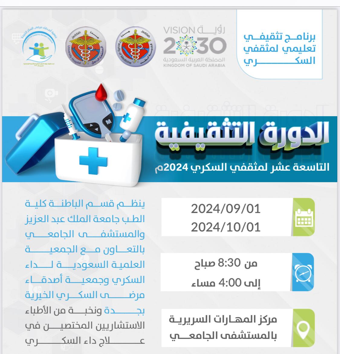 أقامت جمعية أصدقاء مرضى السكر الخيرية بجدة والمستشفى الجامعي ممثل بكلية الطب بجامعة الملك عبدالعزيز قسم الباطنة للسنة التاسعة عشرة على التوالي الدورة التثقيفية لمثقفي السكري تحت إشراف نخبة من الأطباء والمختصين في علاج داء السكري وكيفية التعامل معه.