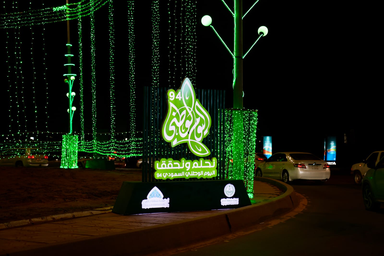 إضافة إلى ذلك، ستضاء الميادين الرئيسية باللون الأخضر، إلى جانب الطرق الرئيسية والفرعية، بالإضافة إلى عروض على شاشات الطرق الرئيسية التي تعرض شعارات اليوم الوطني ورسائل تهنئة، مما يضفي جوًا احتفاليًا على المدينة ويجذب الزوار والمواطنين للاحتفال بروح اليوم الوطني.