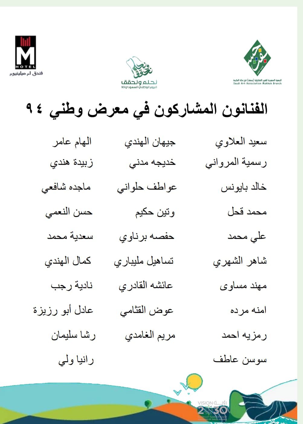 نظمت الجمعية السعودية للفنون التشكيلية جسفت فرع مكة المكرمة يوم الاثنين 23 سبتمبر، معرضها بعنوان "نحلم ونحقق" احتفالا باليوم الوطني الـ (94)، في فندق ام ملينيوم مكة .
