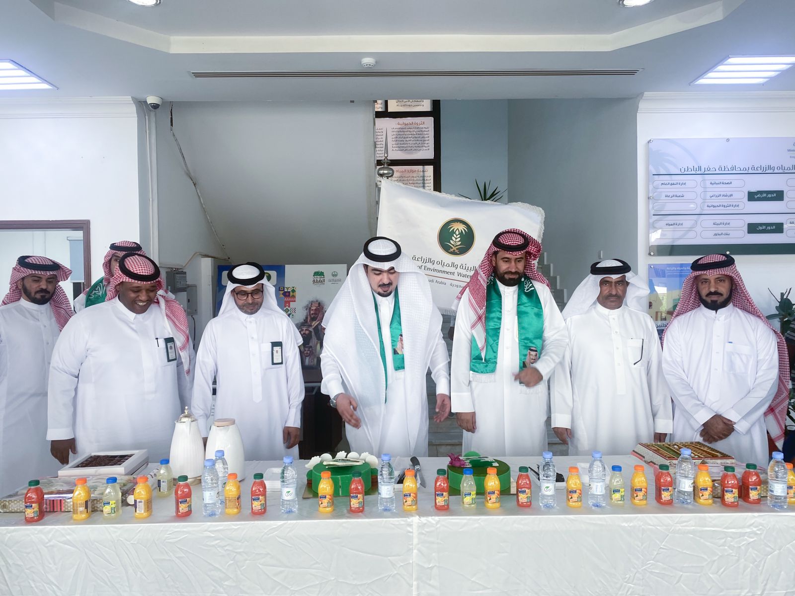احتفل مكتب وزارة البيئة والمياه والزراعة بمحافظة حفرالباطن ابتهاجاً بمناسبة اليوم الوطني94 وذلك بحضور سعادة مدير عام المكتب الاستاذ / زبن بن مزهر الشمري ومدراء الإدارات و الأقسام وعدد من الموظفين وشهد الحفل العديد من الفقرات حيث أفتتح الحفل بأداء السلام الملكي ثم آيات من الذكر الحكيم وتبعها كلمة الاستاذ الشمري تحدث فيها عن فضل الله علينا بأن حبانا وطن ينعم بأمن وأمان وقادة عظام مقدماً التهنئة للقيادة الرشيدة على استمرار المسيرة المليئة بالعطاء مجدداً لهم الولاء والطاعه وسائلاً من الله أن يحفظ هذه البلاد وأن يعيد علينا هذه المناسبه كل عام والجميع بأتم صحة وعافيه وأمن واستقرار.