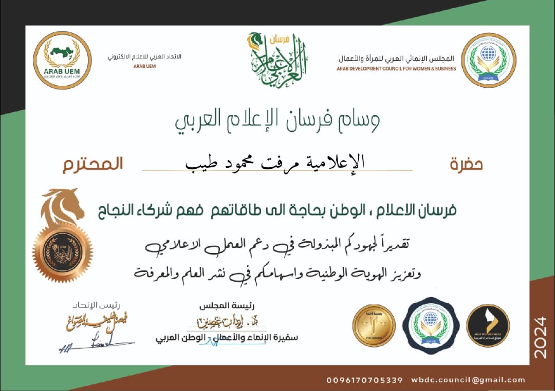 في خطوة رائدة لتكريم الإعلاميين والإعلاميات الذين ساهموا في تطوير الإعلام العربي، أعلن المجلس الإنمائي العربي للمرأة والأعمال برئاسة الدكتورة إيمان غصين عن إطلاق مبادرة "فرسان الإعلام العربي". وتأتي هذه المبادرة بالتعاون مع الاتحاد العربي للإعلام الإلكتروني برئاسة الدكتور فيصل الصواغ من دولة الكويت.