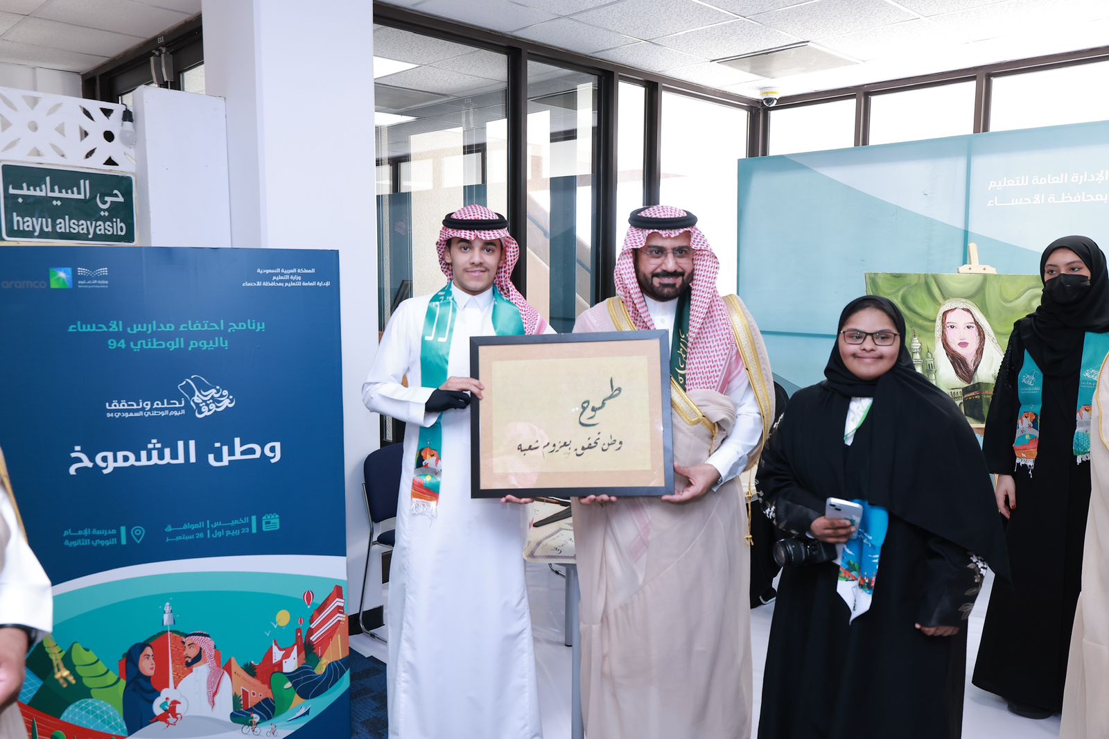 برعاية صاحب السمو الملكي الأمير سعود بن طلال بن بدر محافظ الأحساء ، شهد سعادة وكيل محافظة الأحساء الأستاذ معاذ بن إبراهيم الجعفري ، اليوم " الخميس " ، حفل الإدارة العامة للتعليم بالمحافظة ، بشراكه مع ارامكو السعودية ، بمناسبة اليوم الوطني الـ 94، وذلك في مدرسة الإمام النووي الثانوية ، بحضور وكيل وزارة التعليم للخدمات المشتركة الأستاذ محمد الرشود ، وعدد من قيادات التعليم بالمحافظة