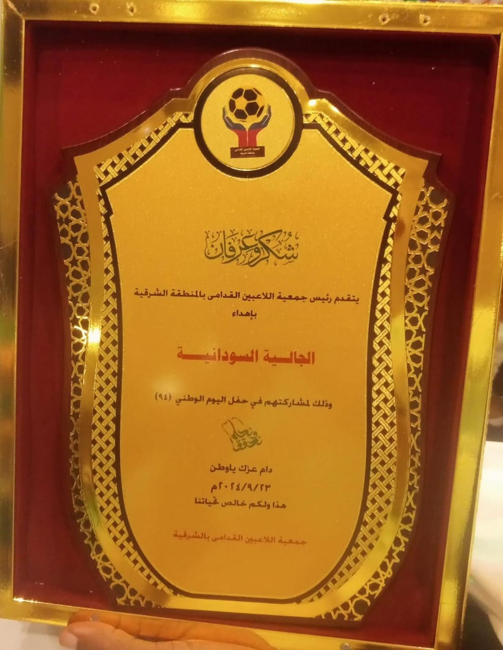 من جهته قدم رئيس جمعية اللاعبين القدامي بالمنطقة الشرقية الأستاذ أحمد بن يوسف النباط درع تذكاري لرئيس الجالية تقديراً وعرفاناً لدورهم وحضوره في المناسبات والفعاليات والأنشطة الرياضية مقدماً الشكر والتقدير لرئيس وأعضاء الجالية السودانية لمشاركتهم في الاحتفال باليوم الوطني ( ٩٤ ) مثمناً كل الجهود ومتمنياً التوفيق للجميع.
