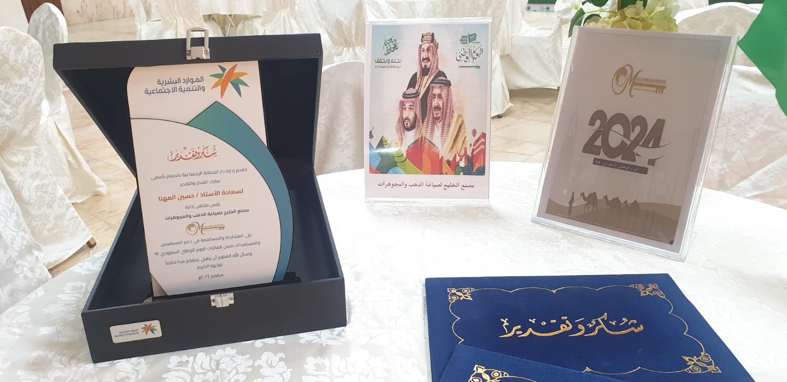 بمبادرة مجتمعية كريمة وبمناسبة اليوم الوطني ٩٤ شارك مصنع الخليج لصياغة الذهب والمجوهرات بتقديم الهدايا لمستفيدات الدار وذلك بدعم من مدير مجلس الإدارة حسين بن محمد المهنا وبمتابعة وحضور مدير المبيعات والتسويق حبيب بن حسن المحمد علي والذي اجتمع مع مديرة الدار أمل بنت حسين عوض وتبادلا النقاش حول احتياجات المستفيدات وامكانية الدعم والتطوير وشكر إتاحة الفرصة لهم تقديم الهدايا ،
