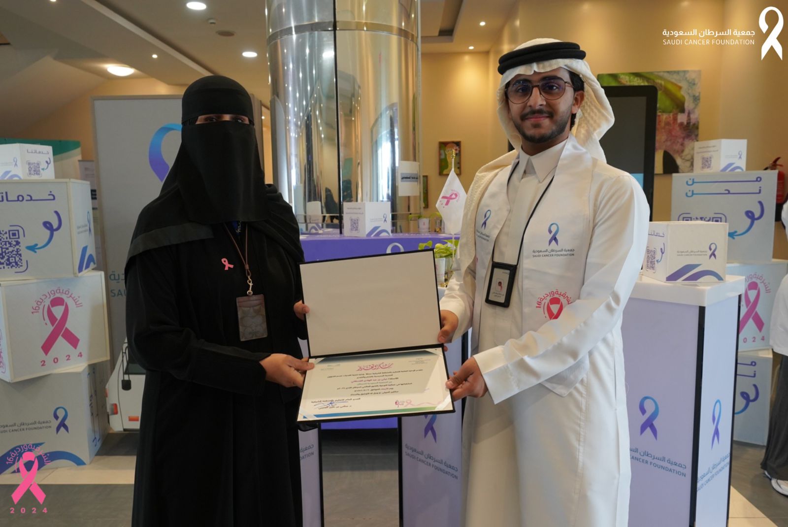 واختتمت الفعالية بتكريم مساعد المدير العام للشؤون التعليمية الأستاذة فاطمة بنت خلف البلوي للإدارة التنفيذية بجمعية السرطان السعودية الأستاذ عصام بن أحمد الجعفري يرافقة فريق العمل .