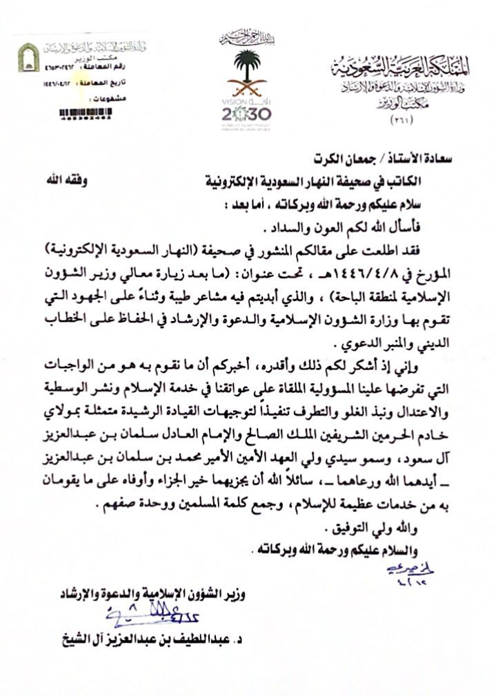 تلقى الكاتب الصحفي الأستاذ جمعان بن علي الكرت خطاب شكر وتقدير من معالي وزير الشؤون الإسلامية والدعوة والإرشاد الدكتور عبداللطيف بن عبدالعزيز آل الشيخ بعد اطلاع معاليه على المقالة المنشورة في "صحيفة النهار السعودية الإلكترونية " تحت عنوان :"ما بعد زيارة معالي وزير الشؤون الإسلامية لمنطقة الباحة".