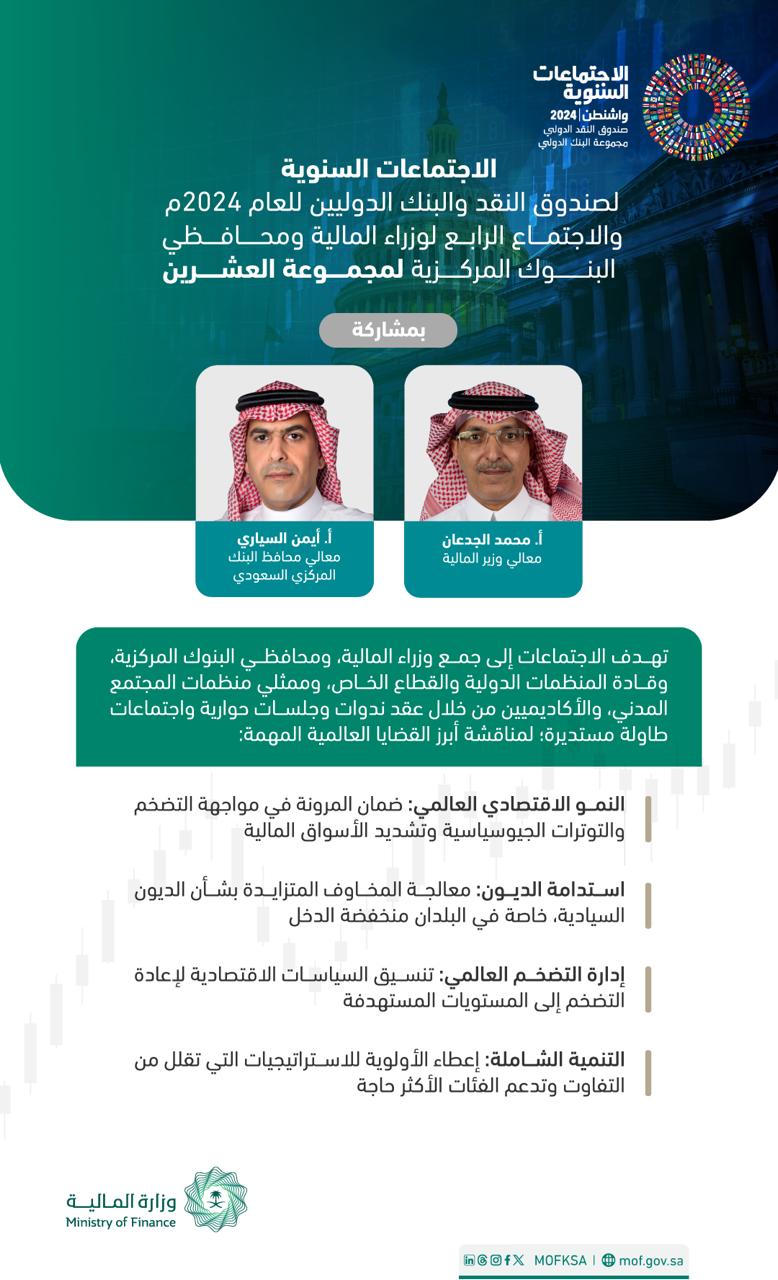 يترأس وزير المالية، الأستاذ محمد بن عبدالله الجدعان وفد المملكة المشارك في الاجتماعات السنوية لصندوق النقد والبنك الدوليين للعام 2024م، والاجتماع الرابع لوزراء المالية، ومحافظي البنوك المركزية لمجموعة العشرين، والتي تعقد في العاصمة الأمريكية واشنطن خلال الفترة 18-23 ربيع الآخر 1446هـ الموافق 21-26 أكتوبر 2024م.