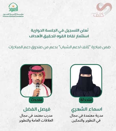 هذا وركزت الجلسة الحوارية على أهمية اكتشاف نقاط القوة وتمكينهم منها وتقويتها، ومعرفة نقاط الضعف والعمل على تقويتها وألا تكون عائقا لهم في تحقيق أهدافهم وانتهاز الفرص وعدم ضياعها بالتسويف.. كما تم عرض تجارب هادفة استفاد منها الجميع. كل الشكر والتقدير لفريق كلف التطوعي ومؤسسة الأميرة العنود والمدربين المبدعين أ.أسماء الشهري وأ. فيصل الفضل.