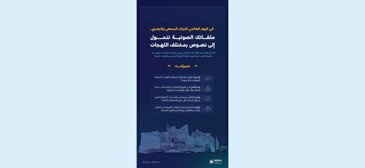 ومن المنتجات التقنية التي طورتها  سدايا  في مجال التراث السمعي والبصري تحويل الملفات الصوتية إلى نصوص باللهجات المحلية السعودية من خلال نظام (صوتك) الذي يتيح تحويل الكلام إلى نصوص دقيقة سواء باللغة العربية الفصحى أو باللهجات المحلية، معتمدًا على تقنيات التعرف على الصوت، ويُستخدم النظام في مجالات متعددة، مثل : تفريغ الاجتماعات والندوات، والجلسات الحوارية، وتحقيق التكامل مع خدمات ذوي الاحتياجات الخاصة لتسهيل وصولهم إلى المعلومات، حيث يعتمد “صوتك” على تقنيات متقدمة في التعرف على الصوت، مما يعزز كفاءة العمليات التي تعتمد على الصوت.