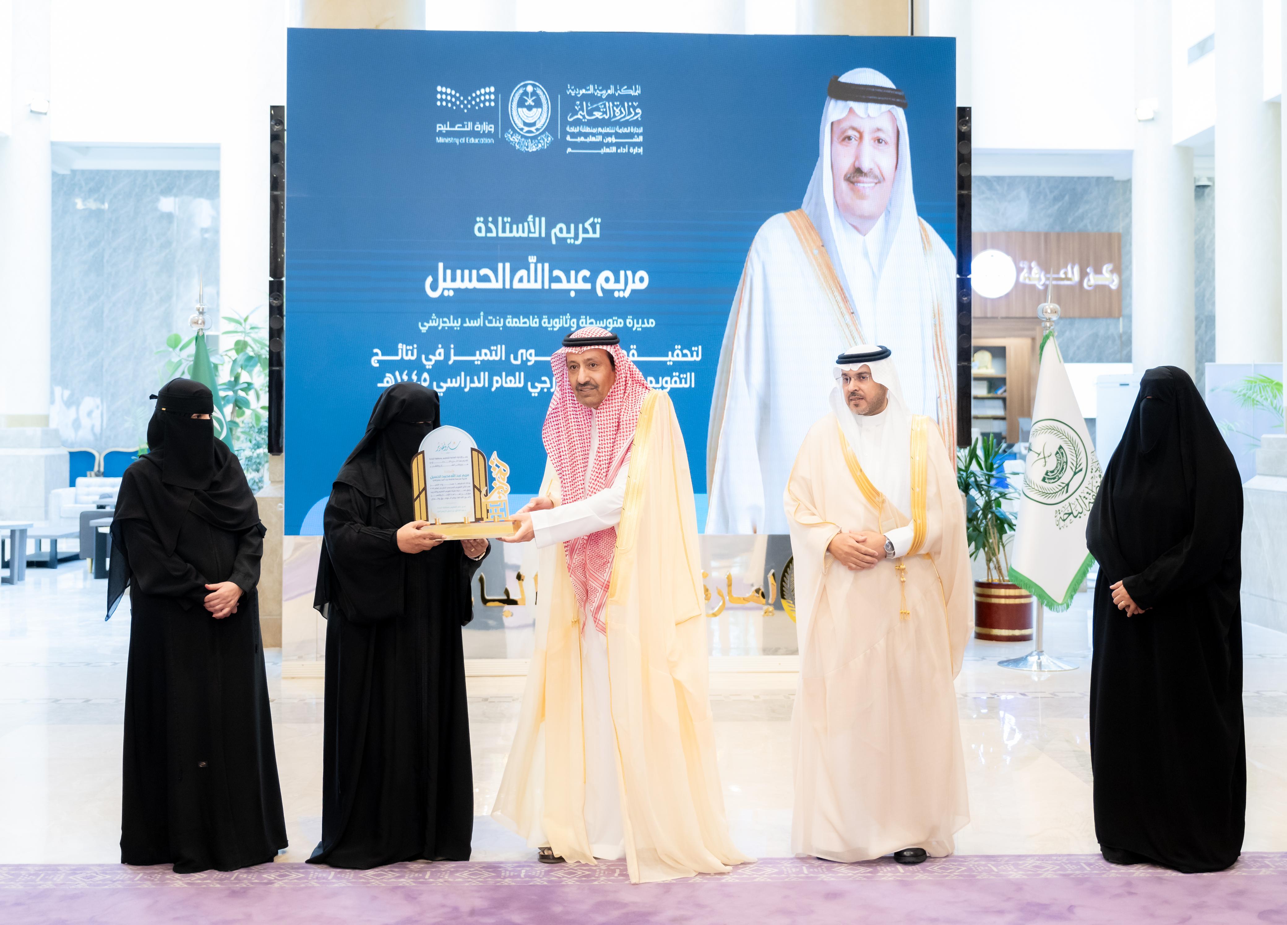 كما كرم أمير منطقة الباحة ، مديرة مدرسة متوسطة وثانوية فاطمة بنت أسد ببلجرشي مريم بنت عبدالله الغامدي ومنسوبات المدرسة لحصولها على جائزة التميز المدرسي على مستوى مدارس المملكة .