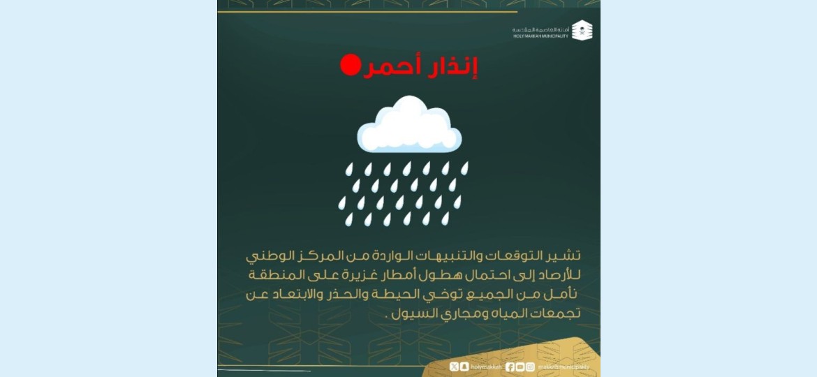 وجددت الأمانة بث رسائلها التوعوية المتعلقة بالإجراءات الوقائية تحسباً لحالة الطقس المتوقعة ؛ وذلك حفاظًا على سلامة السكان والزوار من المخاطر الناتجة عن مياه الأمطار.