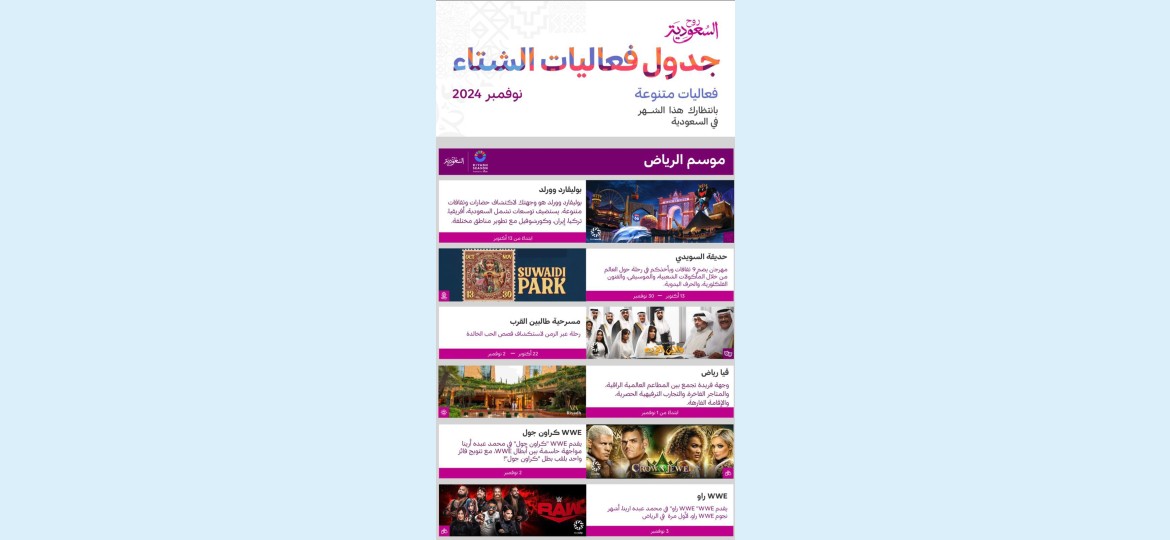 الرياض تبدأ أجواءها الحماسية مع الحدث الذي ينتظره عشاق المصارعة الحرة، حيث تستضيف محمد عبده أرينا في 2 نوفمبر عرض الـ WWE راو لأول مرة في العاصمة السعودية، ما يعد فرصة ذهبية للسياح من عشاق هذا الرياضة لملاقاة نجومهم المفضلين على أرض الواقع وسط أجواء حماسية.