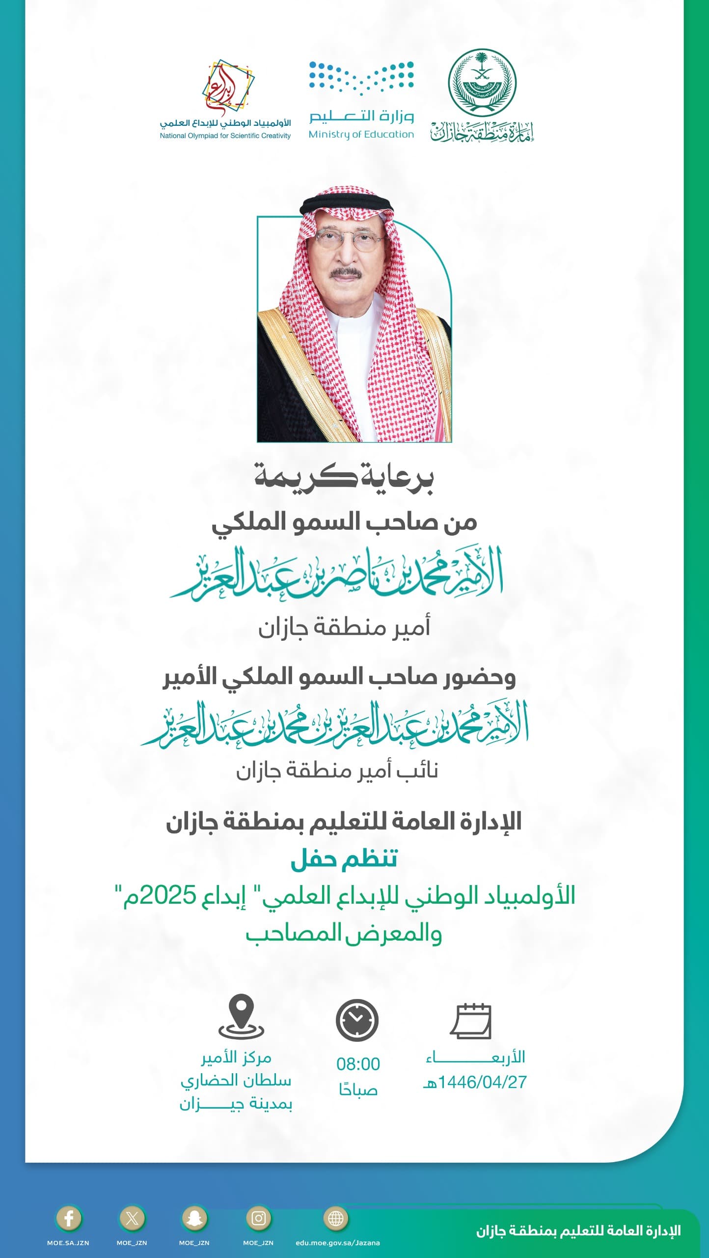 يرعى صاحب السمو الملكي الأمير محمد بن ناصر بن عبدالعزيز أمير منطقة جازان، بحضور صاحب السمو الملكي الأمير محمد بن عبد العزيز بن محمد بن عبدالعزيز نائب أمير المنطقة، غدًا، حفل الأولمبياد الوطني للإبداع العلمي " إبداع جازان 2025م" والمعرض المصاحب الذي تنظمه الإدارة العامة للتعليم بمنطقة جازان، بمركز الأمير سلطان الحضاري بمدينة جيزان.