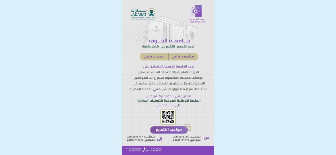 دعت جامعة الجوف الخريجين الحاصلين على الدرجات العلمية والتخصصات المناسبة إلى التقديم لشغل وظيفة ( مشرف رياضي - مدرب رياضي ) والمشمولة بسلم رواتب الموظفين العام ( الإدارية ) عن طريق التعاقد، وفق ما ورد في اللائحة التنفيذية للموارد البشرية في الخدمة المدنية.