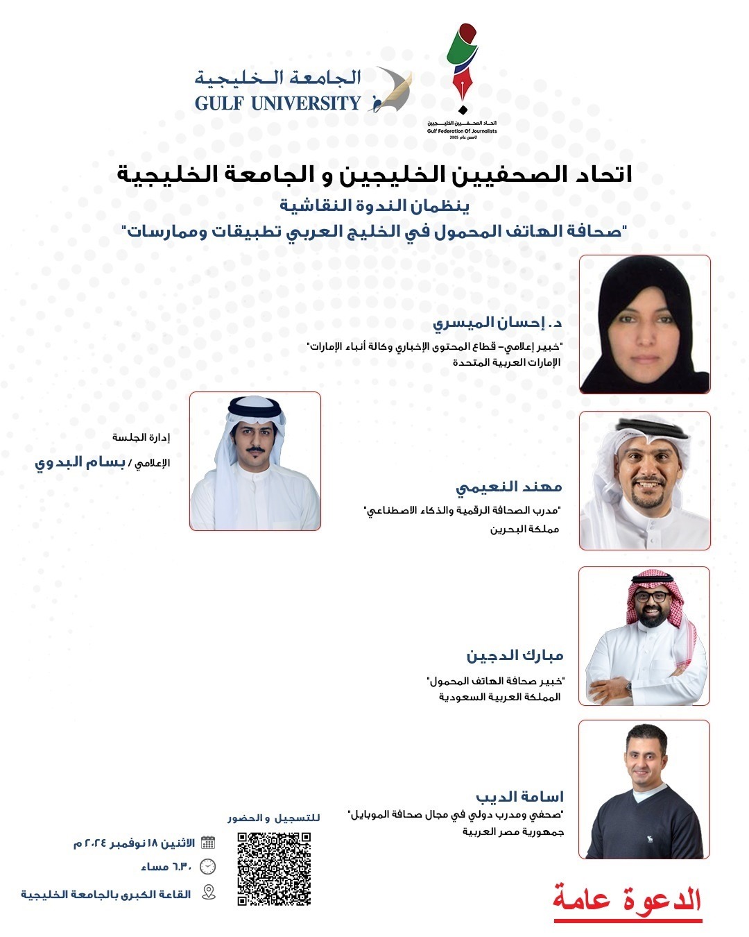تضم الندوة نخبة من المتحدثين والمتخصصين، من بينهم: الدكتورة إحسان الميسري، خبير إعلامي في قطاع المحتوى الإخباري بوكالة الأنباء الإماراتية بدولة الإمارات العربية المتحدة؛ ومهند النعيمي، مدرب الصحافة الرقمية والذكاء الاصطناعي من مملكة البحرين؛ ومبارك الدجين، خبير في صحافة الهاتف المحمول من المملكة العربية السعودية؛ وأسامة الديب، صحفي ومدرب دولي في مجال صحافة الموبايل من جمهورية مصر العربية، كما يدير الندوة الإعلامي بسام البدوي من مملكة البحرين.
